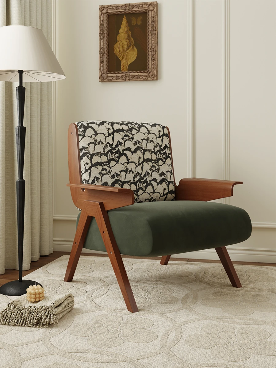 侘寂スタイルの一人掛けソファチェア - アンティーク風の無垢材使用、軽やかなラグジュアリー感。デザイナーズリビングやバルコニー、民宿に最適なリラックスチェア。あなたのくつろぎ空間にぴったり!