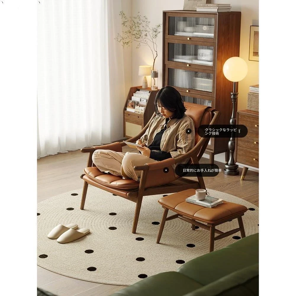 北欧デザインの本革ウッドソファチェア - 極上のリラックスタイムを提供する老虎椅子。おしゃれな午後のひとときにぴったりな軽奢なレイジーチェア。バルコニーでの快適な昼寝にも最適!