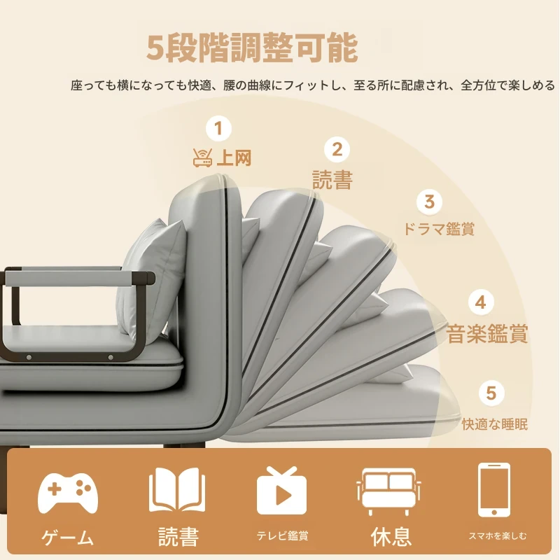 リラックスソファ:寝転んでも寝られる!リビングや寝室にぴったりのコンパクトな一人用ソファ。バルコニーや窓辺、畳の上でも使える折りたたみ式ソファベッド。快適さと機能性を兼ね備えた理想のアイテムです!