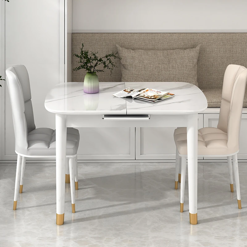 現代的でシンプルなデザインの岩板ダイニングテーブル&チェアセット - 小さなスペースに最適!伸縮可能な折りたたみ式で、食事のスタイルに合わせて変形する円形テーブル。あなたの家に洗練されたエレガンスをプラス!