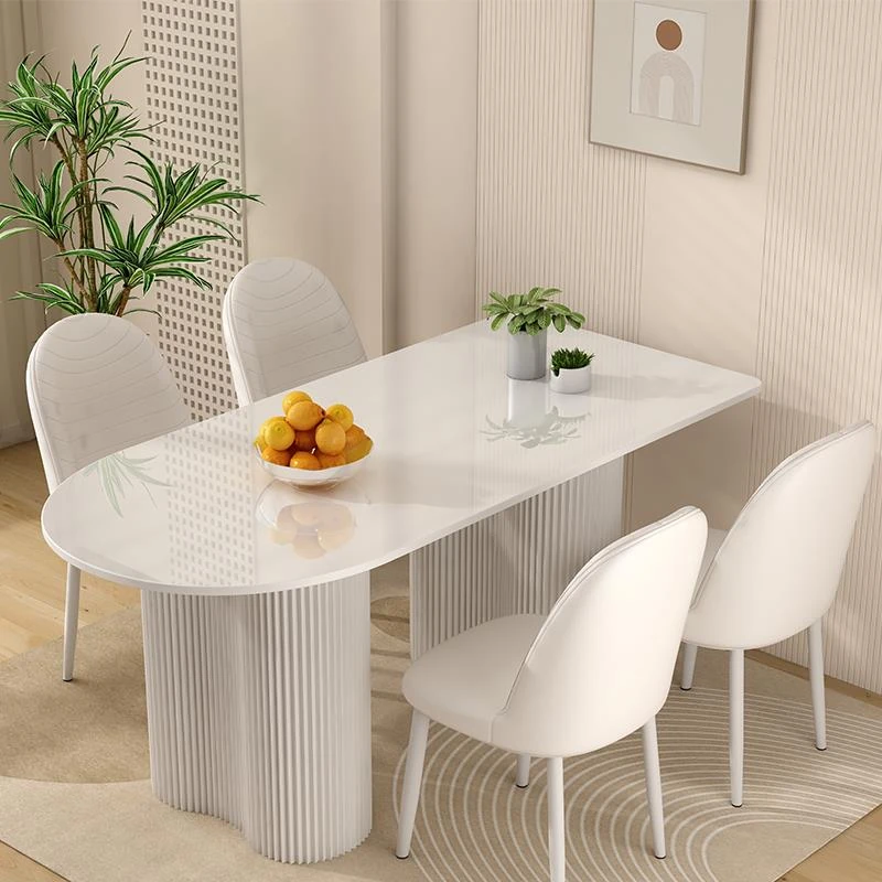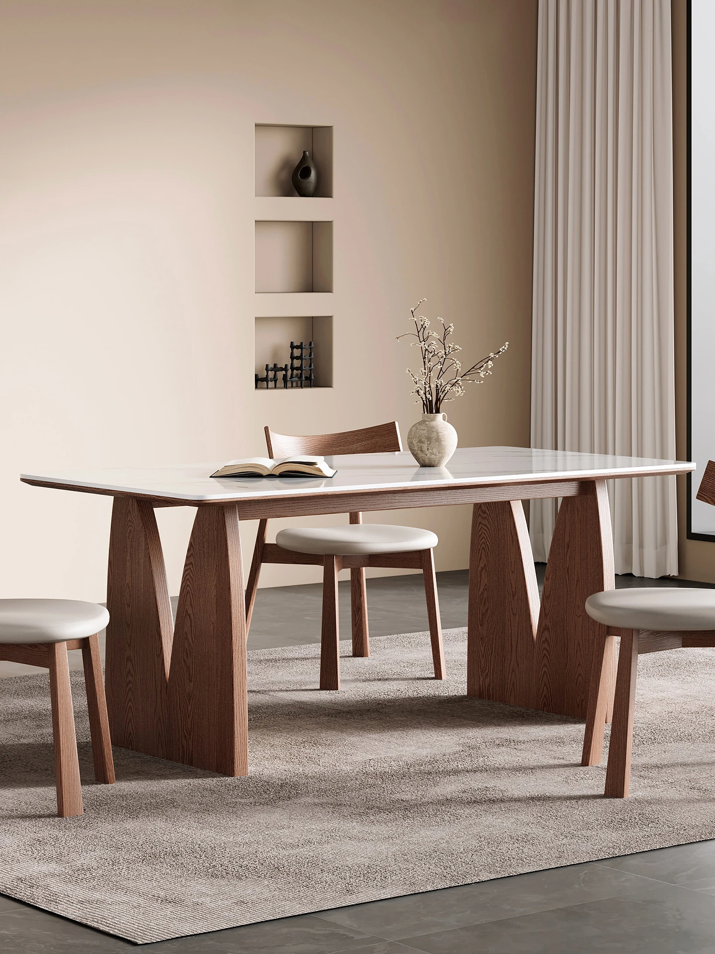 無垢材のクリーム色レトロ岩板ダイニングテーブル ホワイトアッシュ製 エレファントレッグデザイン コンパクトな小型住宅に最適なモダンシンプルな長方形テーブルで、スタイリッシュな食卓を演出します!