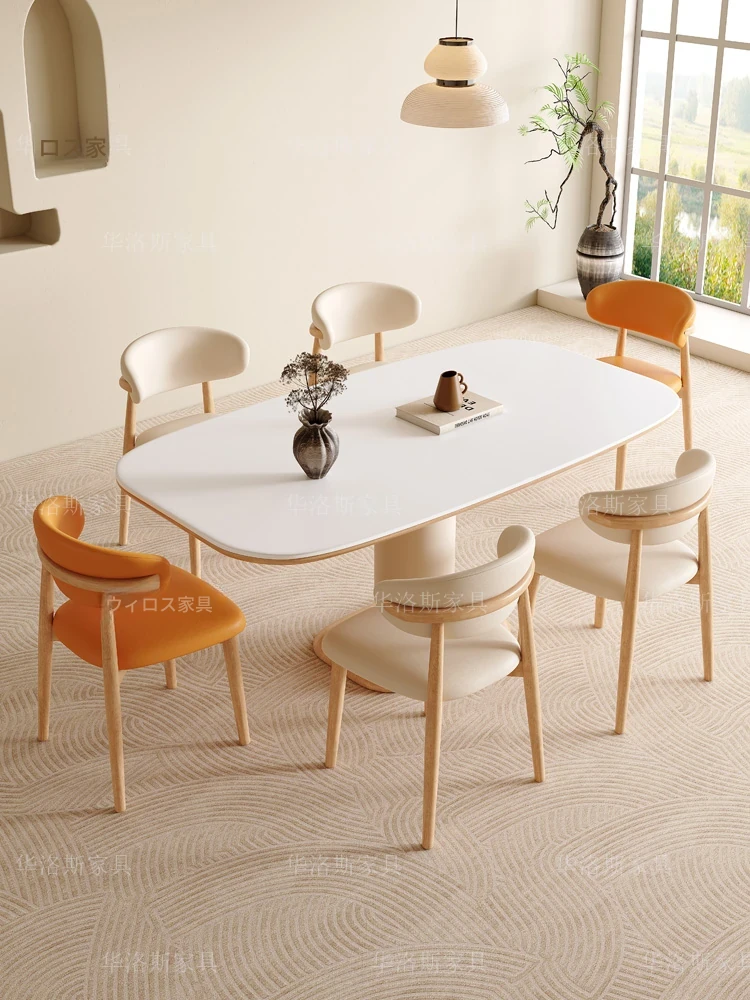 フランス風クリームカラーの長方形岩板ダイニングテーブル&チェアセット - 北欧スタイルの天然木日式全実木製、家庭にぴったりの優雅な食卓。