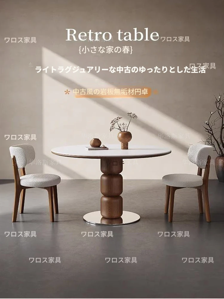 レトロ風の岩板ダイニングテーブル | 天然アッシュ材使用 | 洞石デザインの丸型 | ミニマルでおしゃれな中古風 | 小型住宅にぴったりの食卓 | 家族や友人との楽しい食事タイムを演出!
