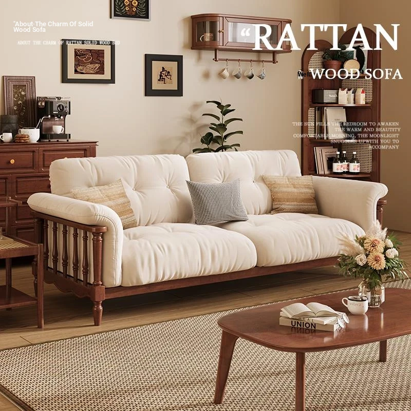 [Free Shipping to Hong Kong] Vintage French Solid Wood Cloud Sofa - Stylish 3-Seater for Small Spaces, American Mid-Century Cream Color, Perfect for Cat Lovers!