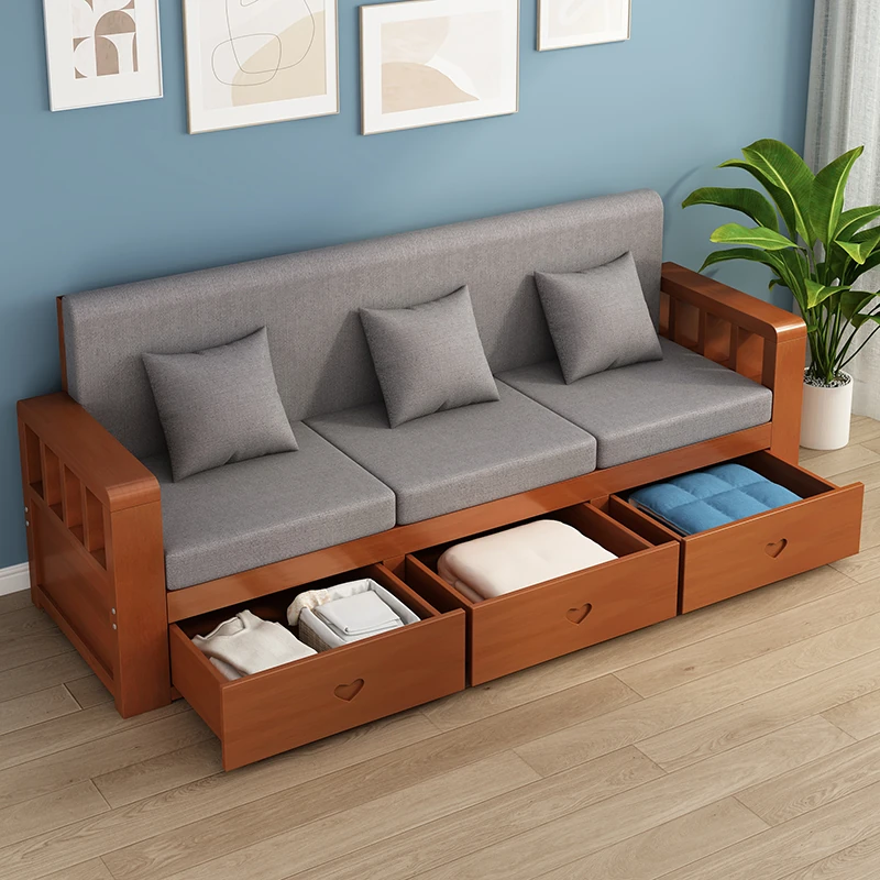 Free Shipping in Hong Kong - Solid Wood Sofa with Storage Drawers, Modern Chinese Style, Perfect for Small Living Rooms, 3-Seater, Versatile for Winter and Summer.