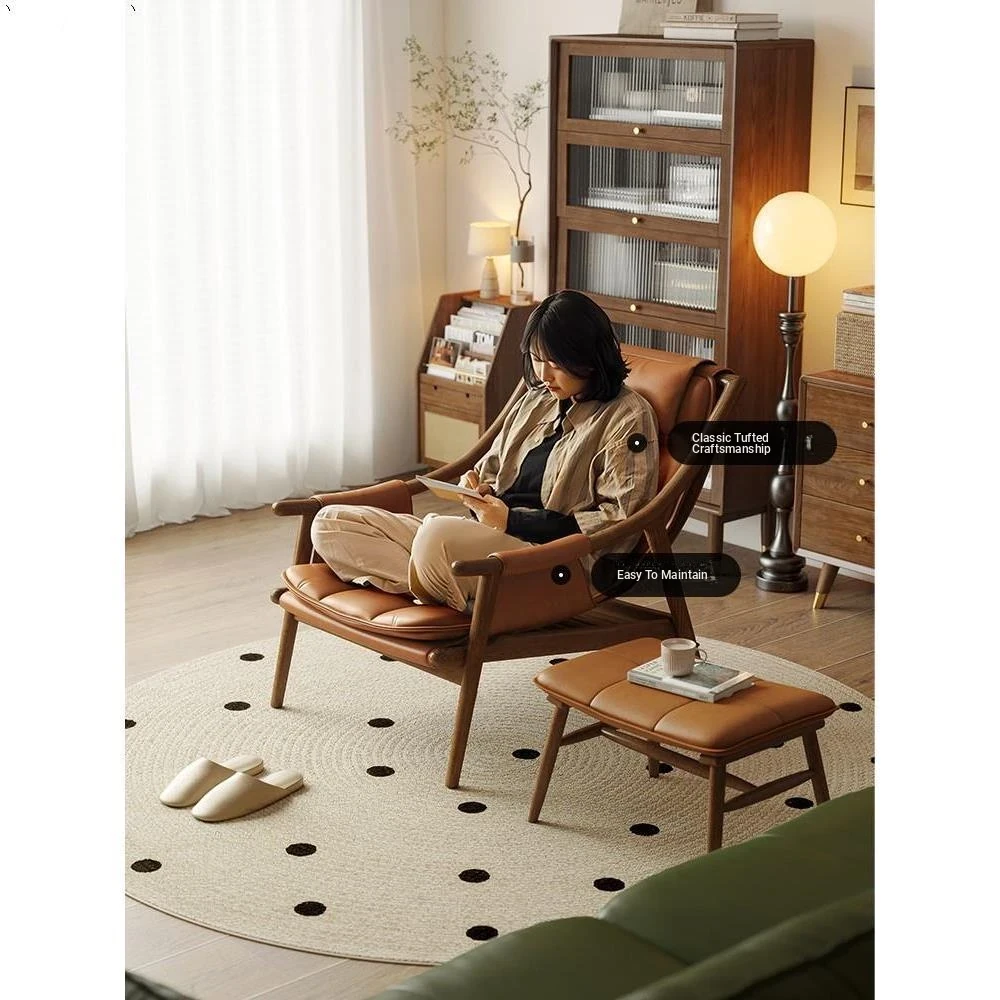 Nordic Designer Solid Wood Genuine Leather Lounge Chair - Luxurious Tiger Chair for Relaxation, Perfect for Afternoon Naps on the Balcony or Living Room