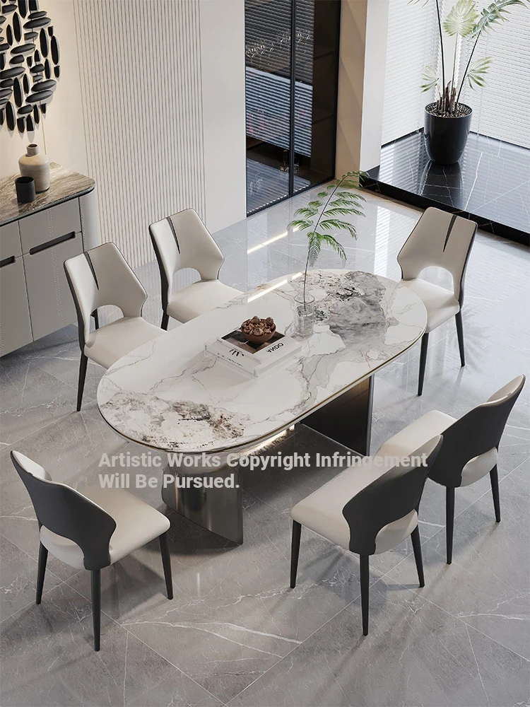 Elegant Italian Minimalist Style Dining Set - Luxurious Oval Stone Table with Stainless Steel Chairs for Modern Home Decor - High-Quality, Glossy Finish