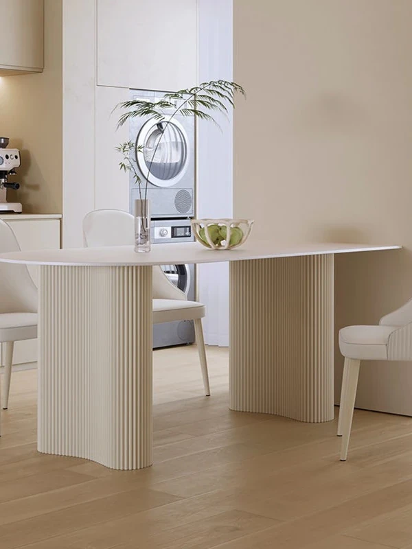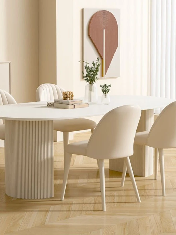 Elegant Creamy White Rock Dining Table Set - Modern Minimalist Oval Design for Small Spaces, Perfect for Luxurious Home Dining Experience