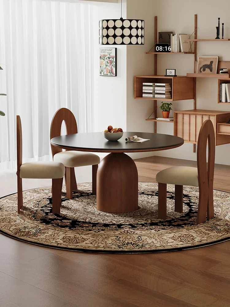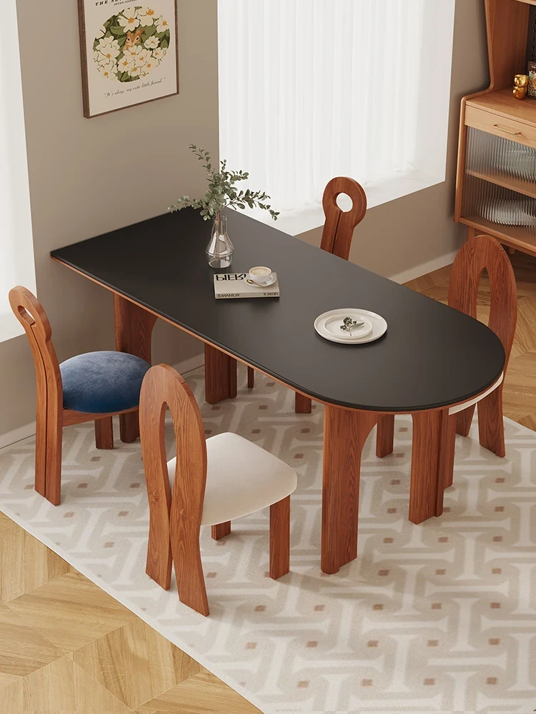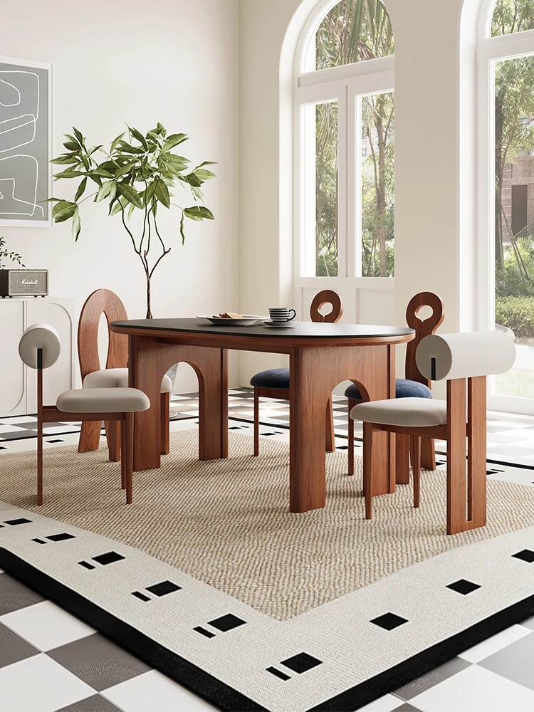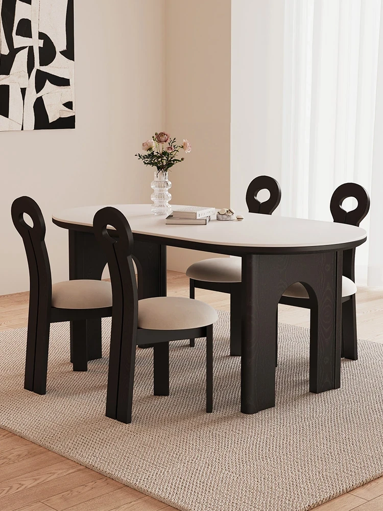 Vintage Solid Wood Dining Table and Chairs Set - Black Ash Wood with Rock Panel, Retro Minimalist Design for Stylish Home Dining Room