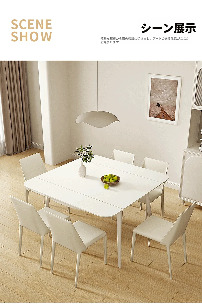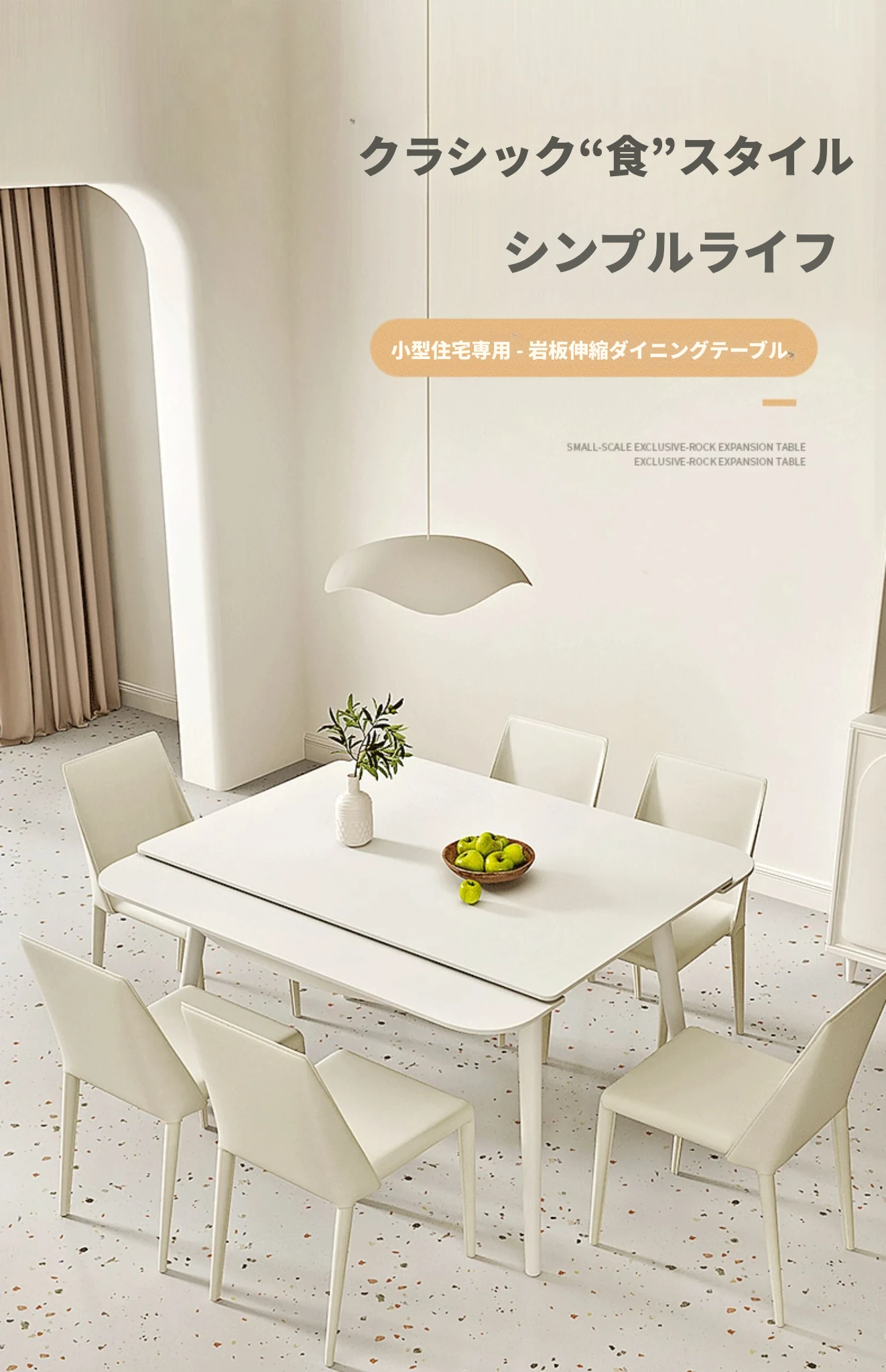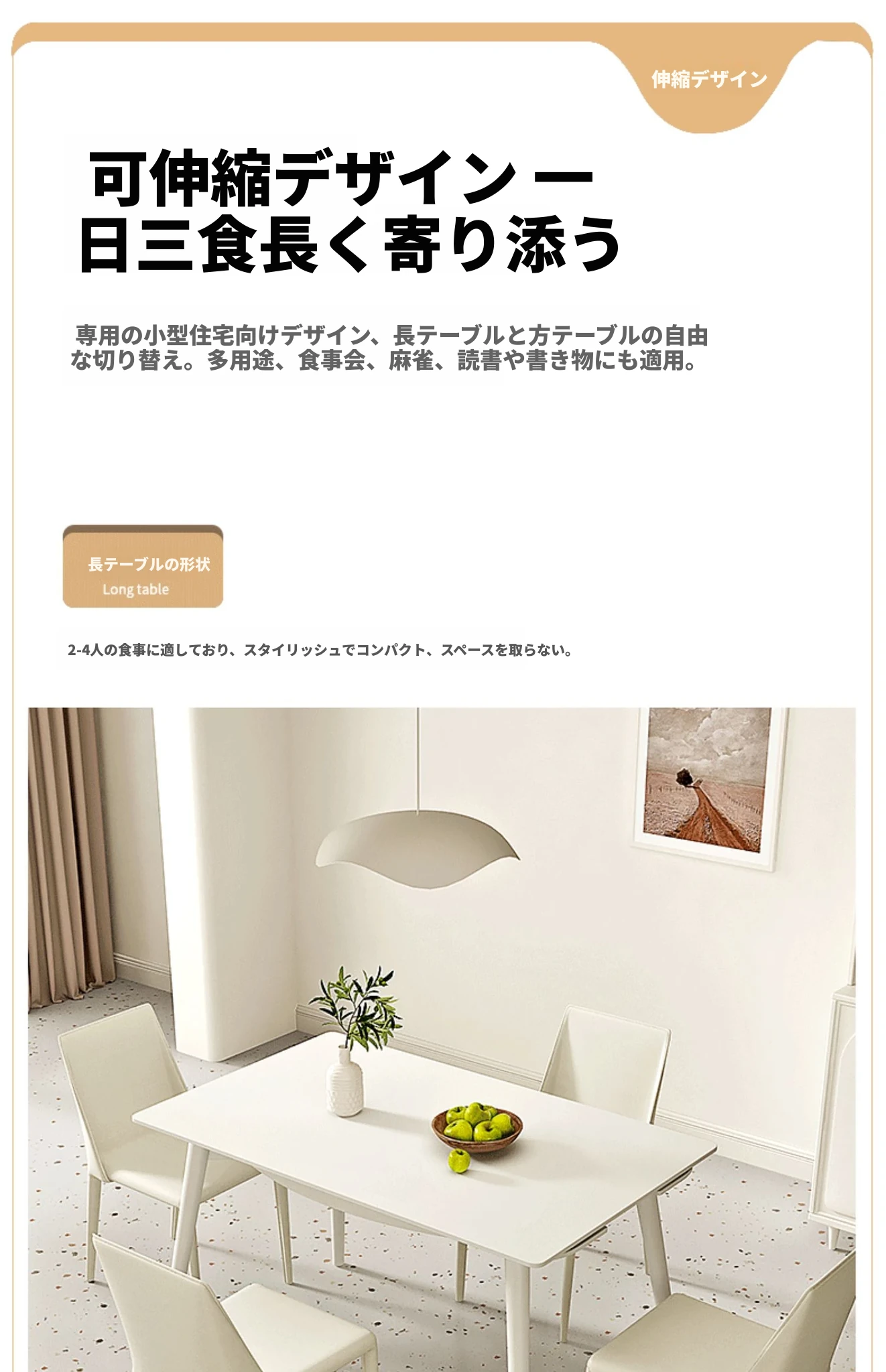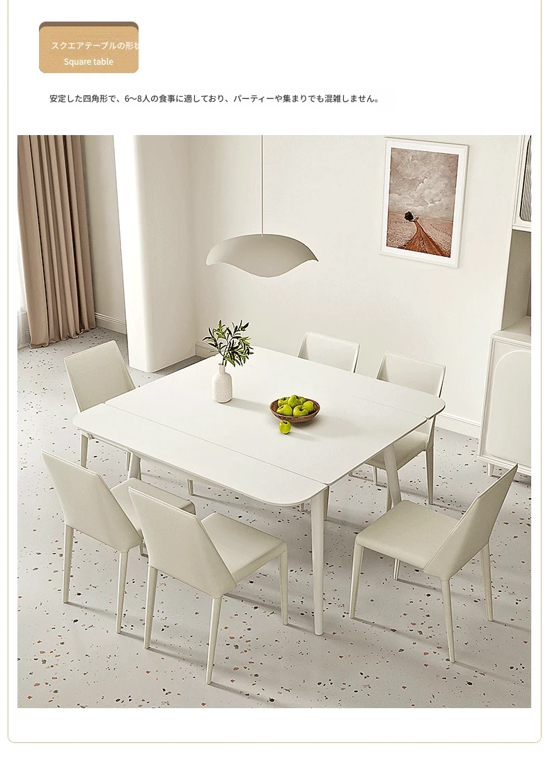 クリーム風の岩板ダイニングテーブル - 小型住宅向け、折りたたみ式・伸縮可能な正方形テーブル。2024年新モデル、丸型にも変形可!おしゃれで機能的なデザインで、食事の時間を特別なものに。