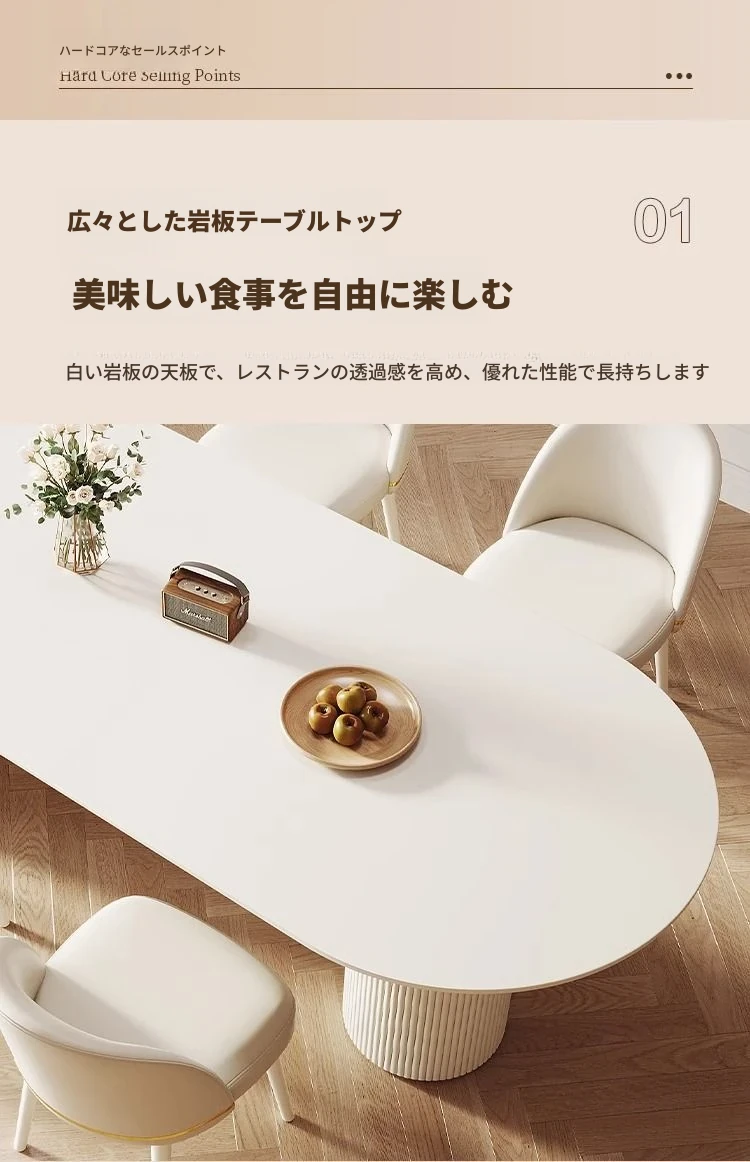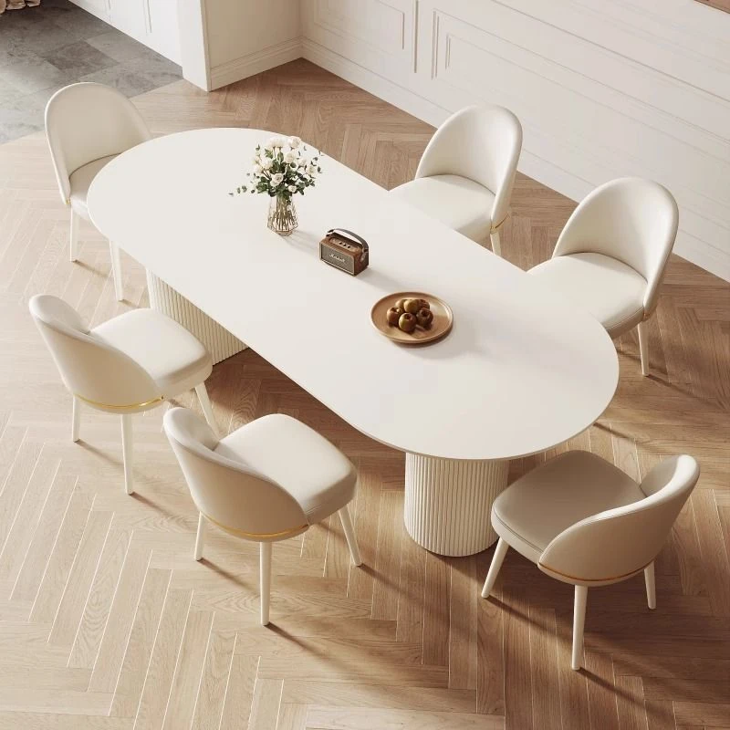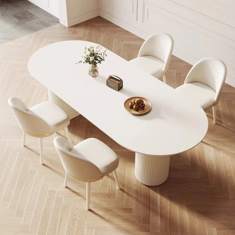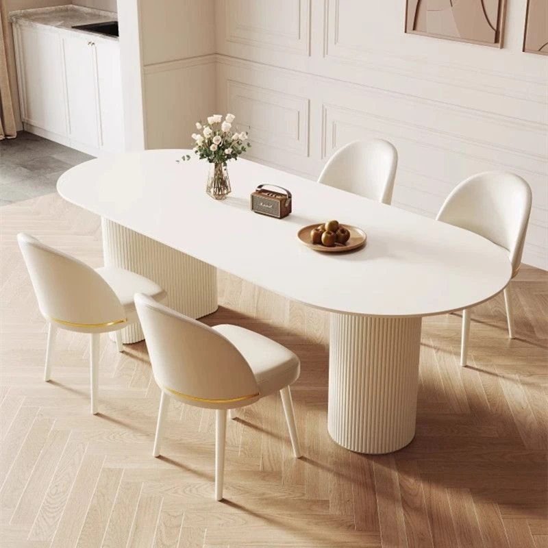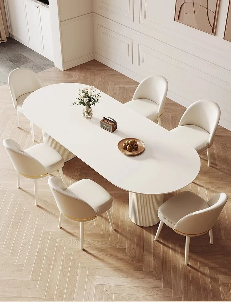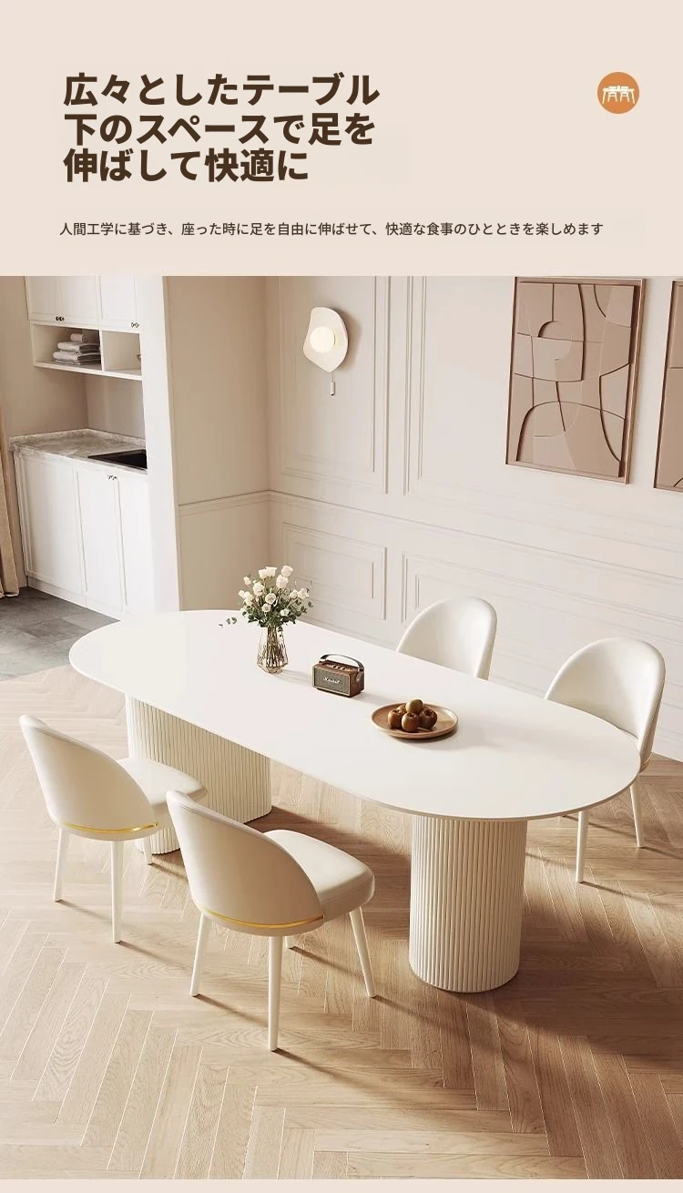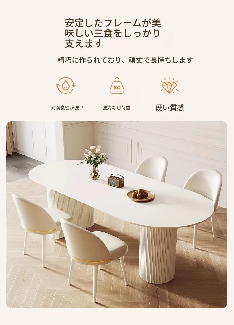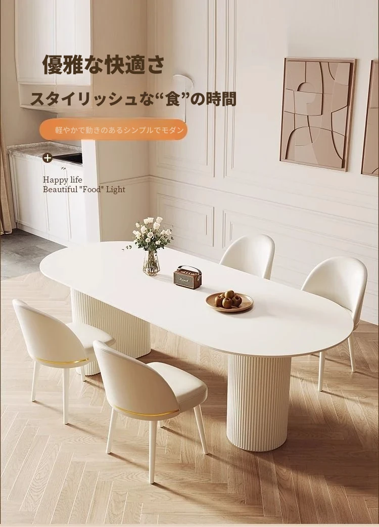 クリームホワイトの純白い岩板ダイニングテーブル - 家庭用、小型スペースに最適な軽やかでラグジュアリーな現代的エレガントデザインの楕円形テーブル&チェアセット!