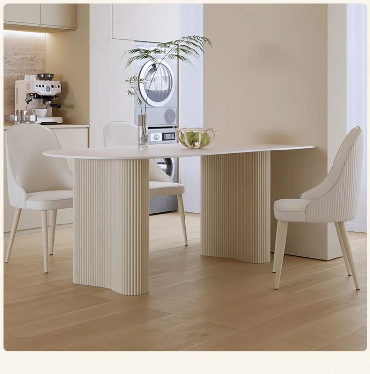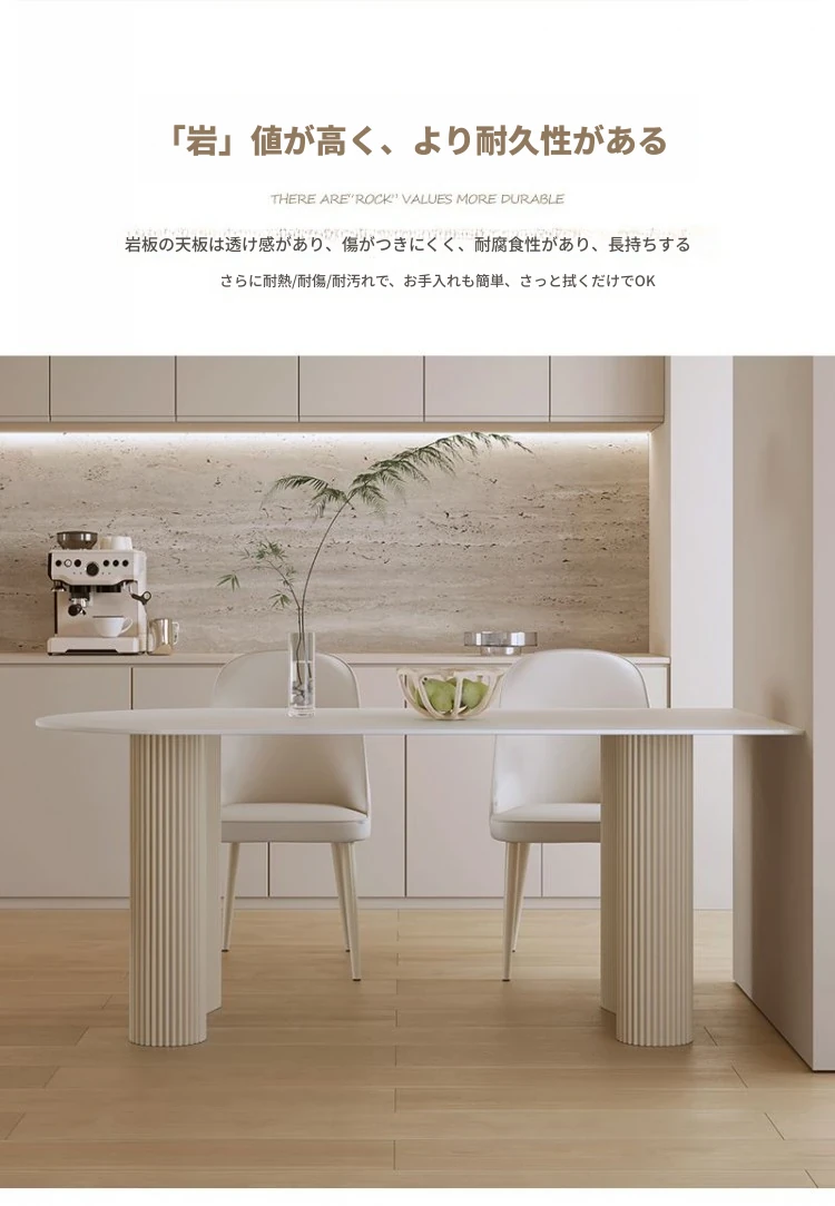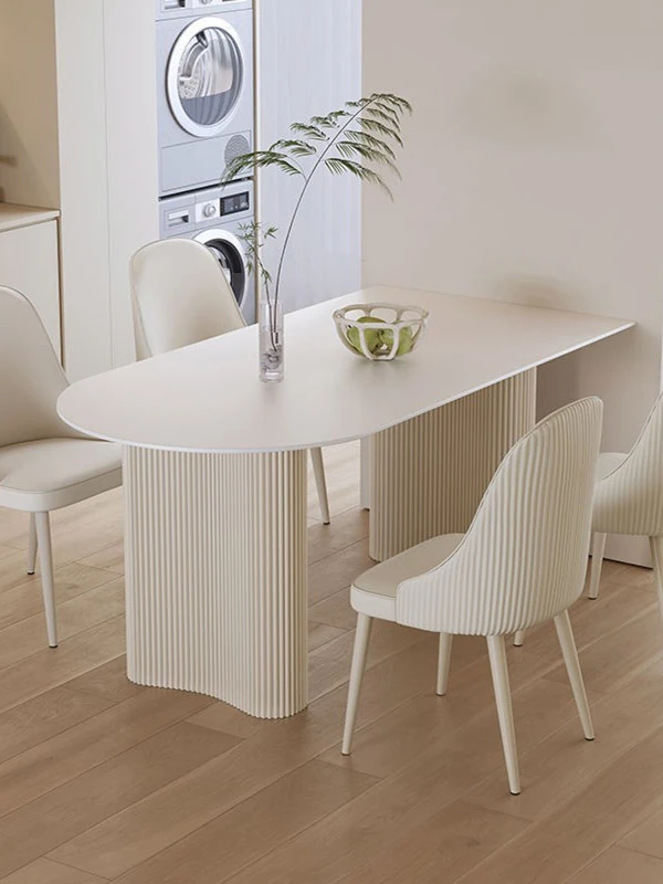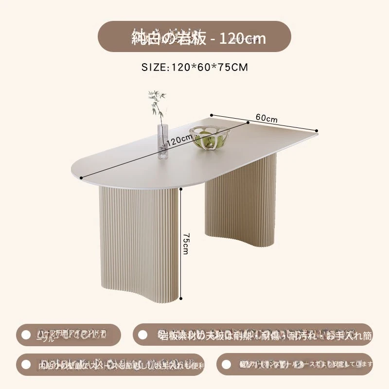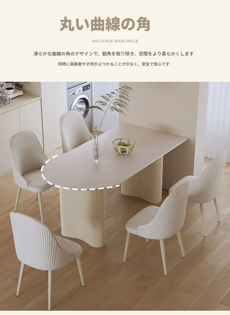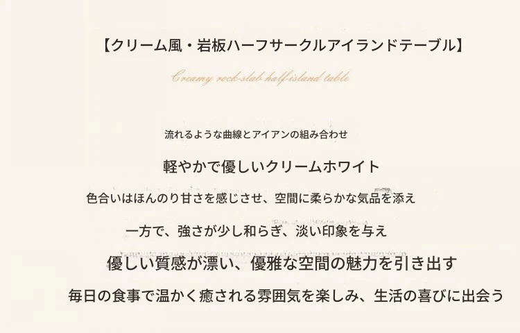 現代的なミニマリストデザイン!半円形の岩板アイランドテーブル - 家庭用や小型オフィスに最適。クリーミーな風合いで、軽やかなラグジュアリーを演出。面談や食事にぴったりなスタイリッシュなダイニングテーブルです。
