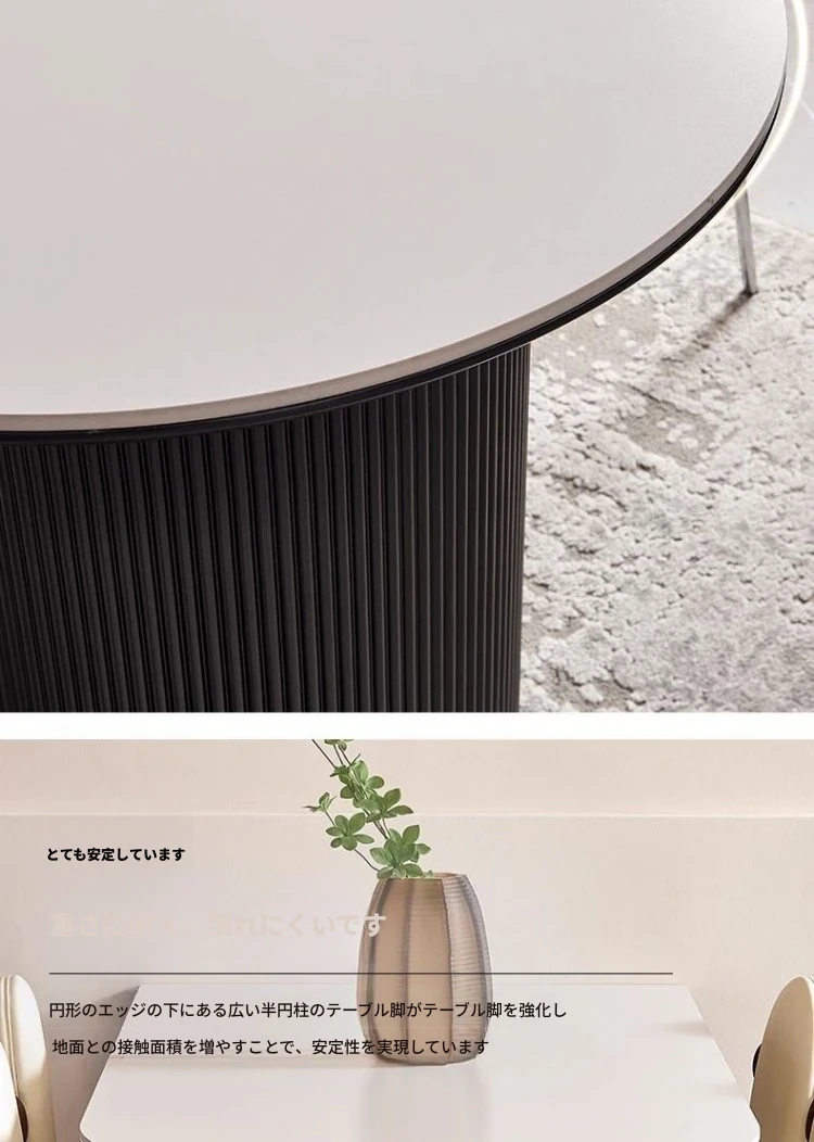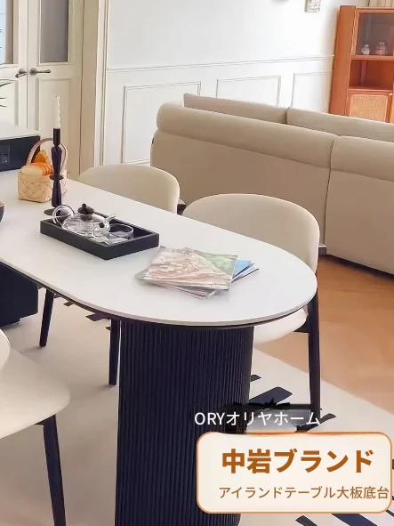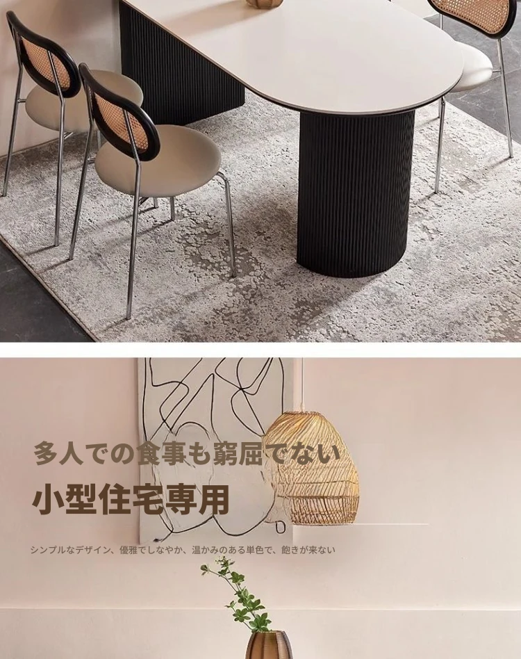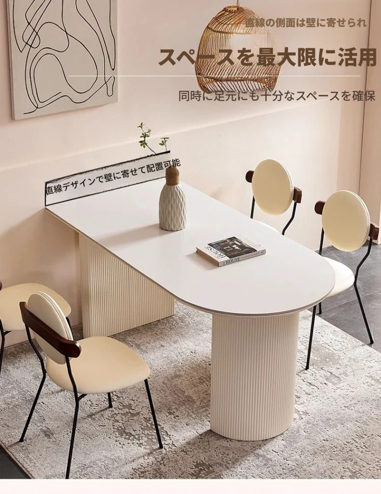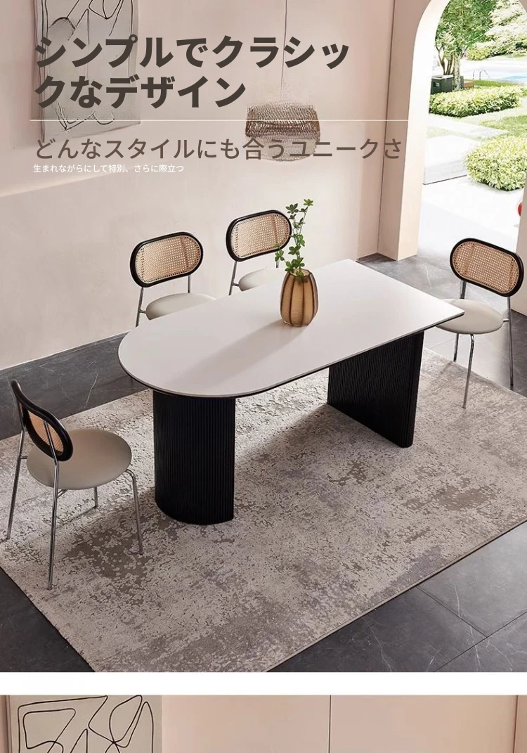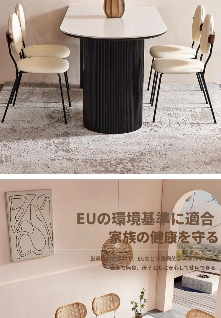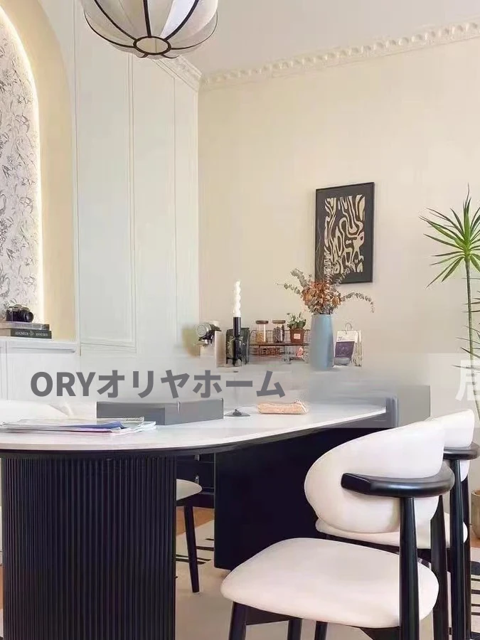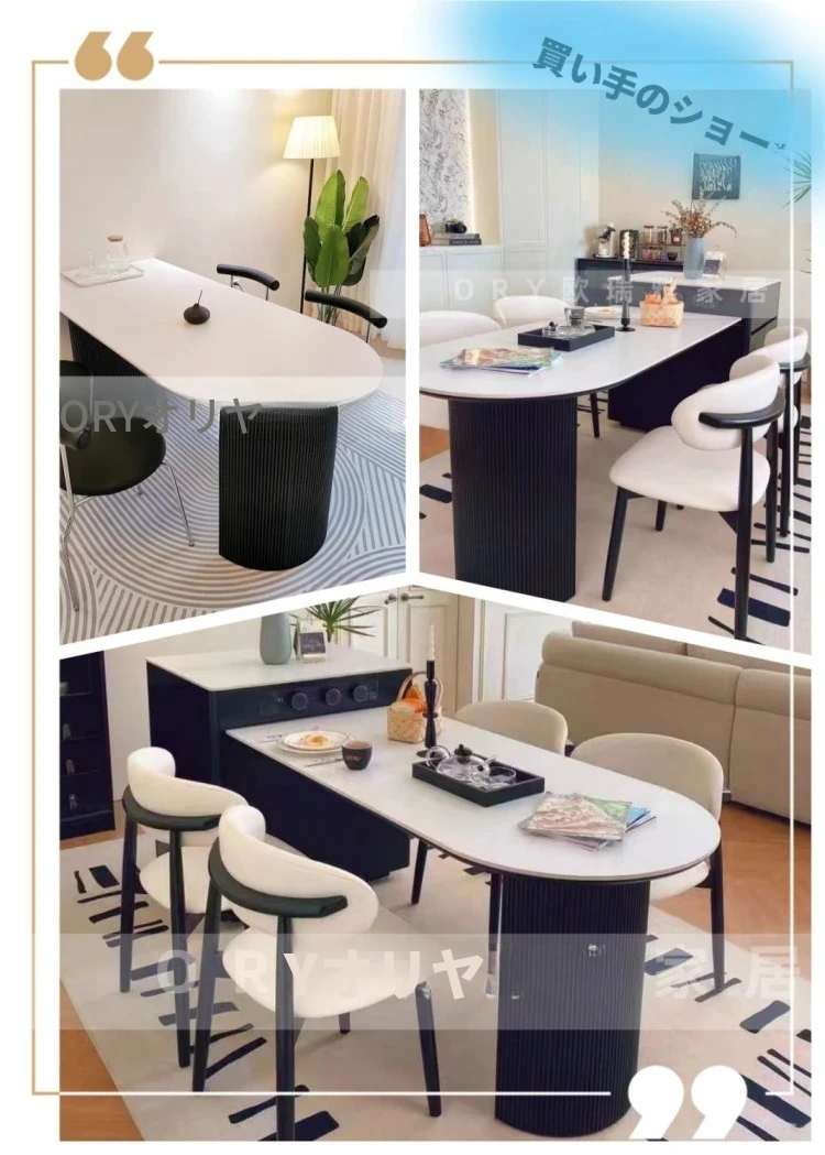 北欧スタイルのアイランドテーブル、岩板使用のダイニングテーブル&チェアセット。コンパクトなハーフサークルデザインで、モダンでラグジュアリーな雰囲気を演出。小さなスペースに最適なシンプルな食卓。