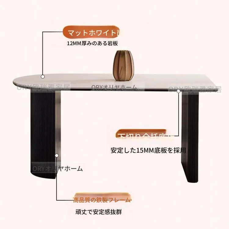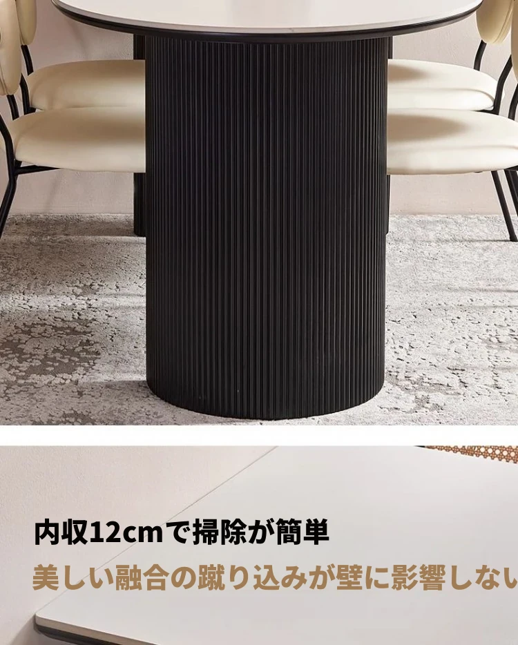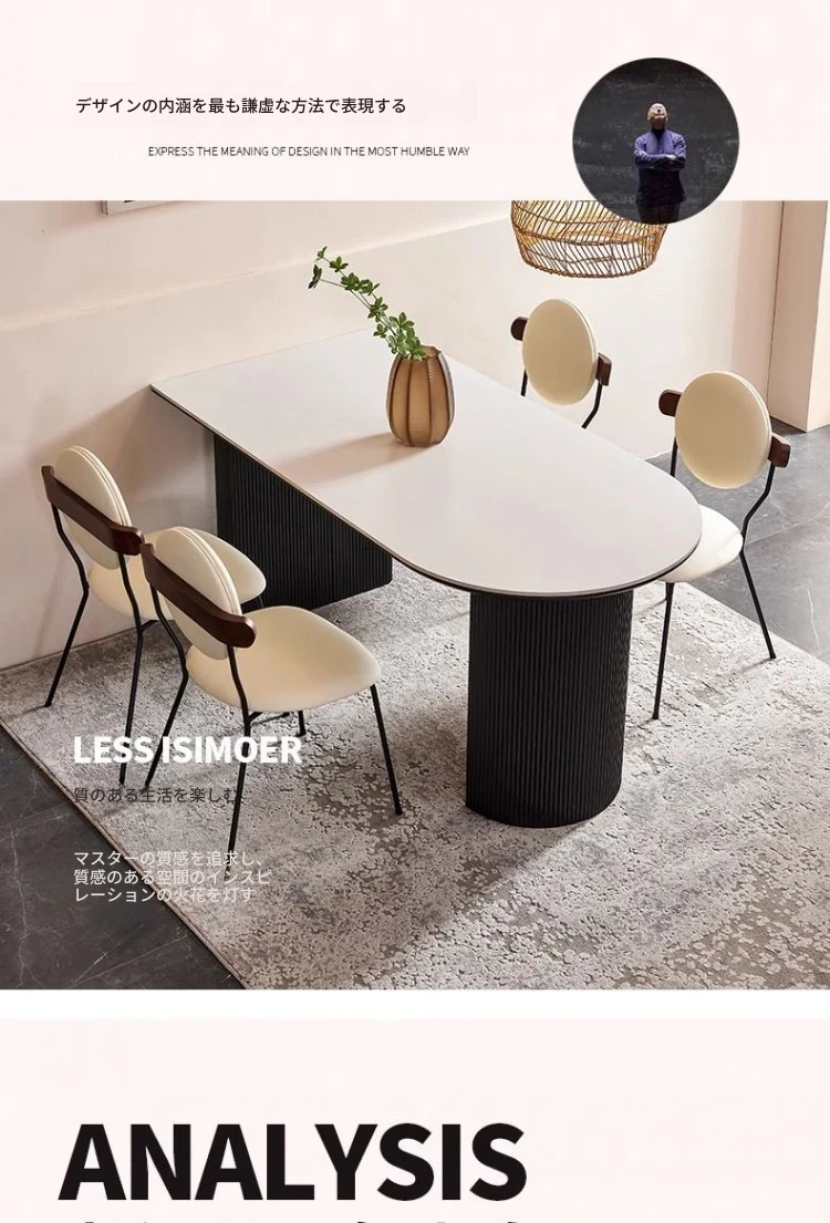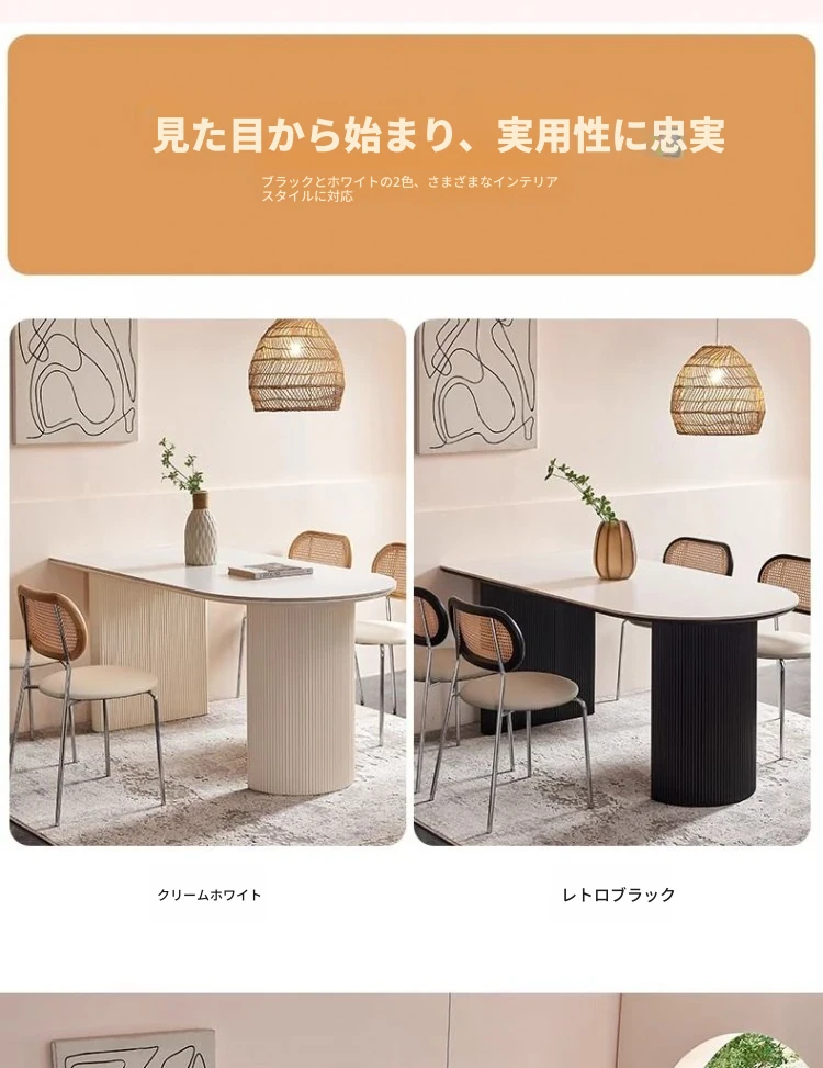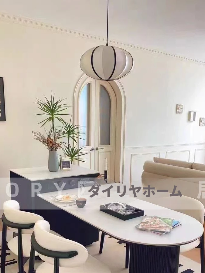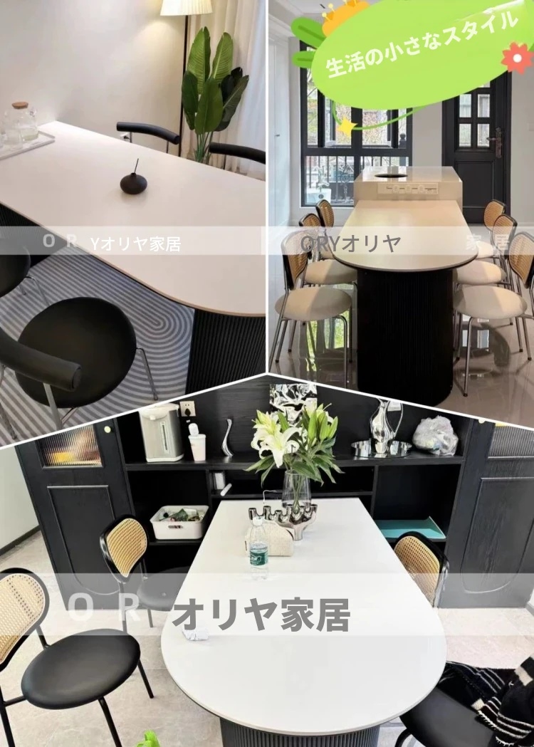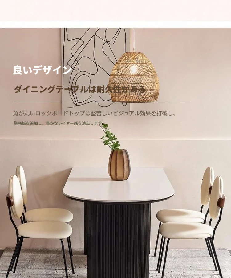 北欧スタイルのアイランドテーブル、岩板使用のダイニングテーブル&チェアセット。コンパクトなハーフサークルデザインで、モダンでラグジュアリーな雰囲気を演出。小さなスペースに最適なシンプルな食卓。