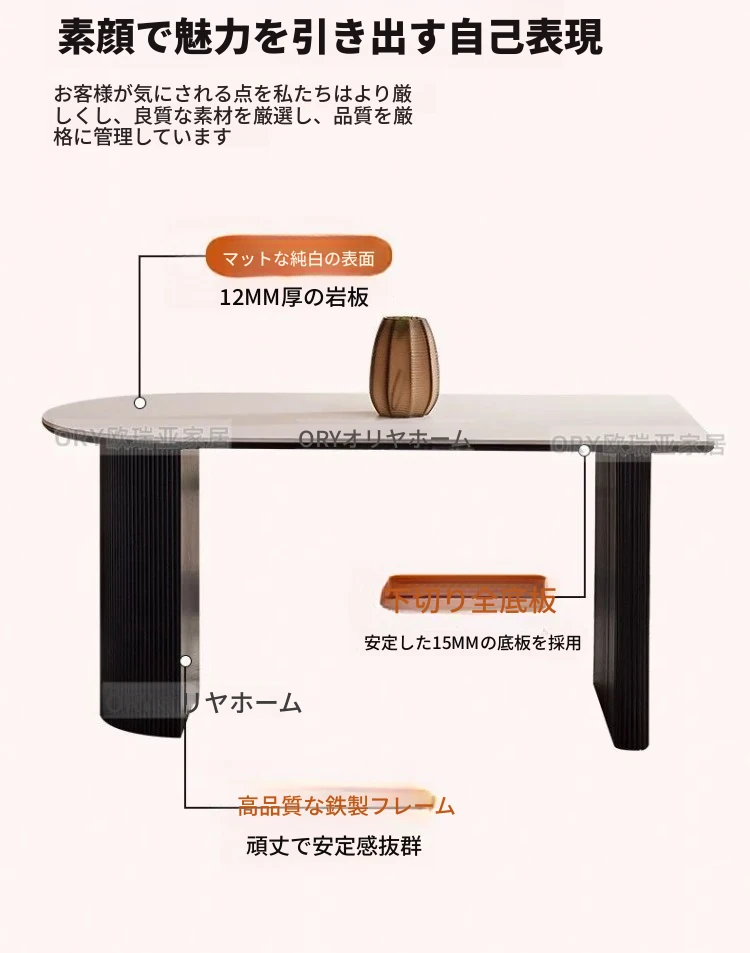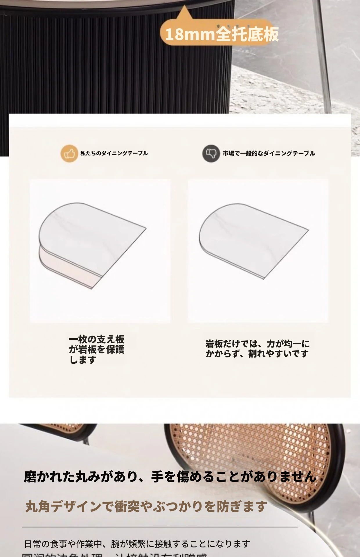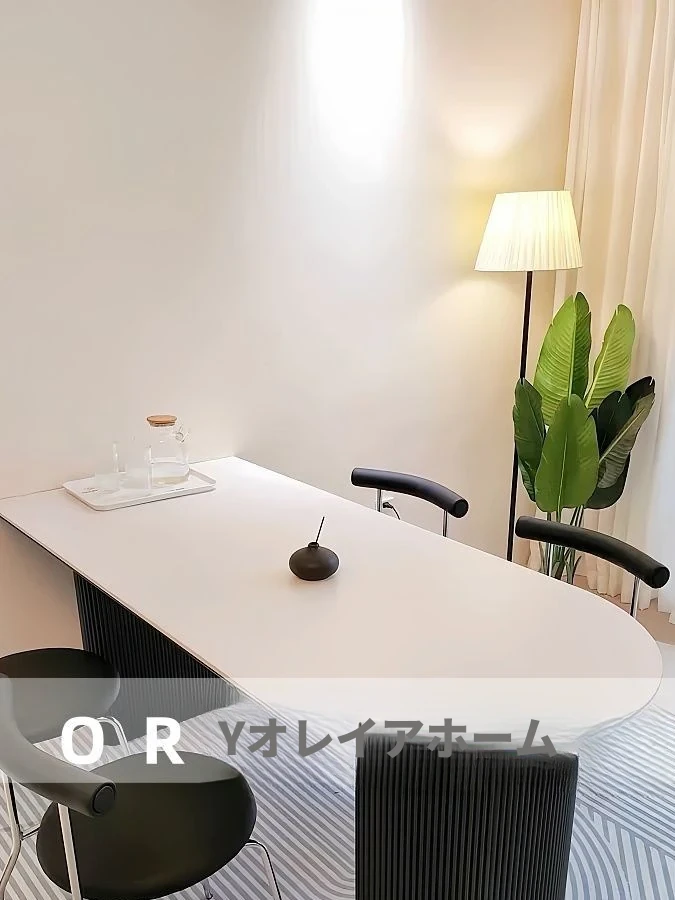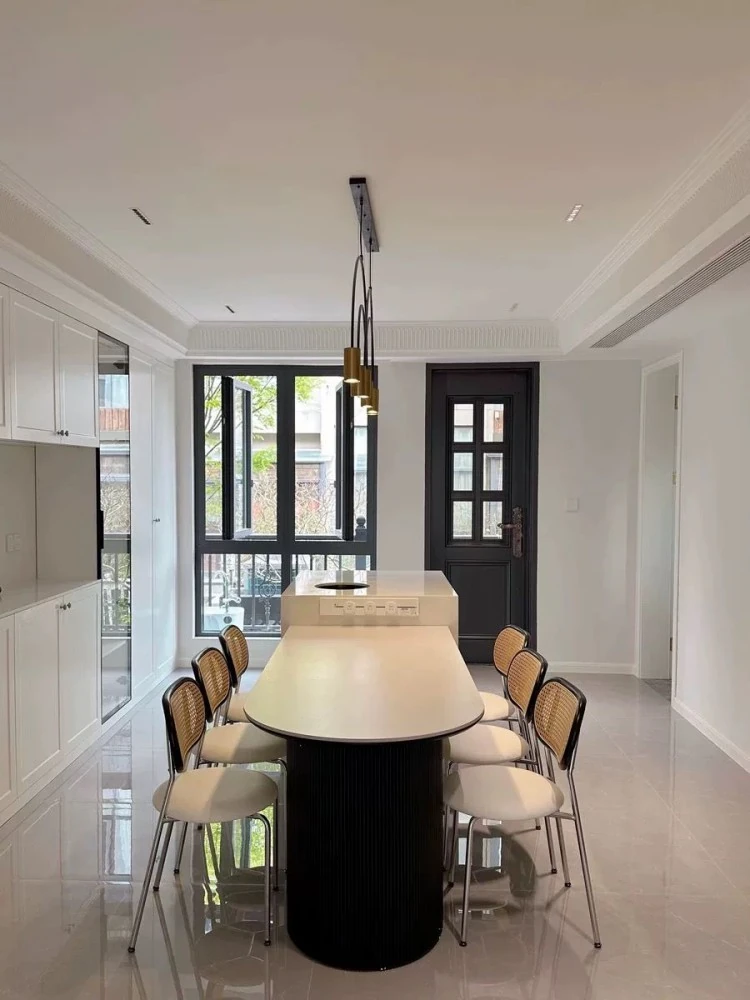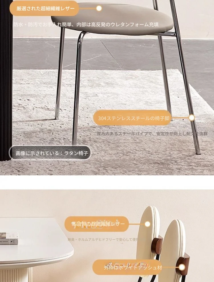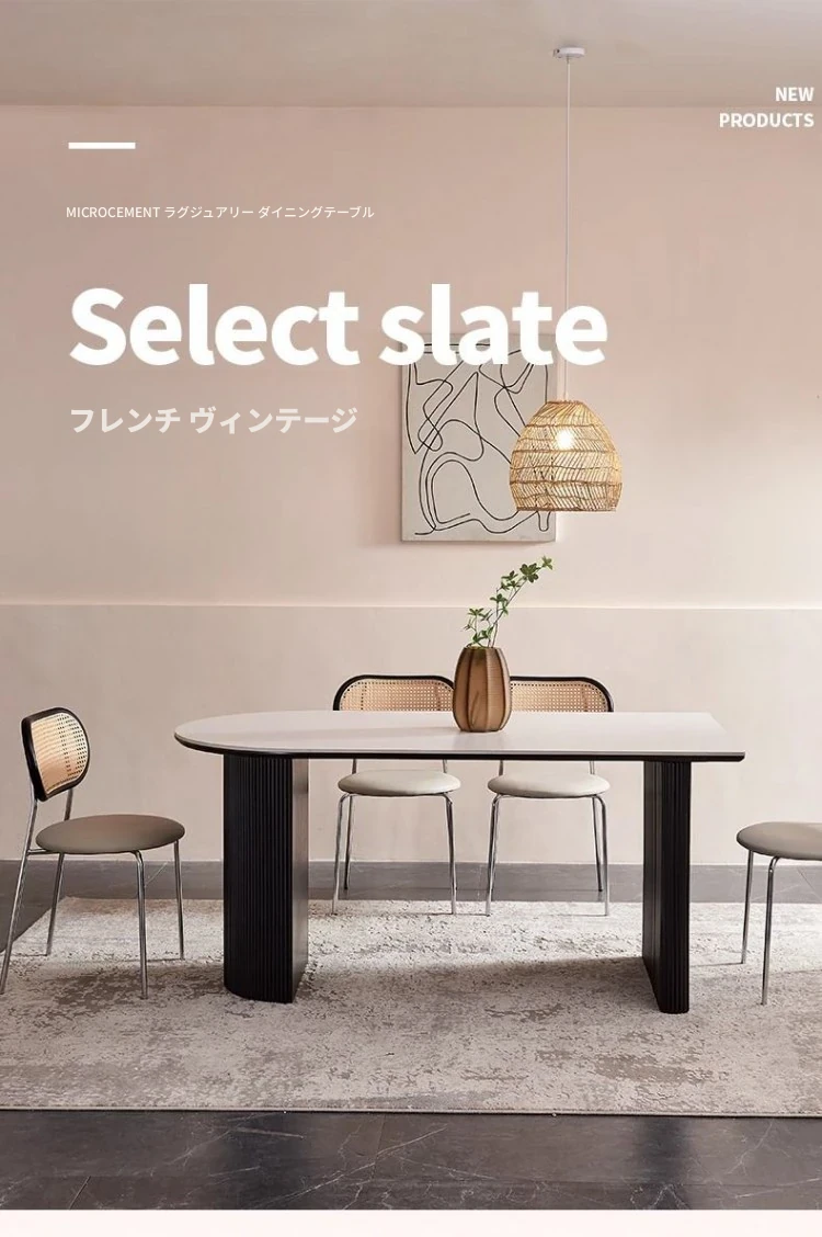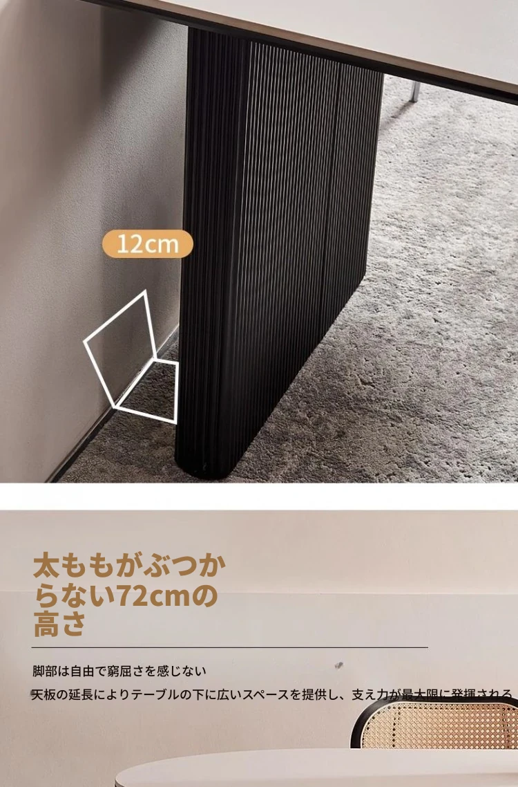 北欧スタイルのアイランドテーブル、岩板使用のダイニングテーブル&チェアセット。コンパクトなハーフサークルデザインで、モダンでラグジュアリーな雰囲気を演出。小さなスペースに最適なシンプルな食卓。