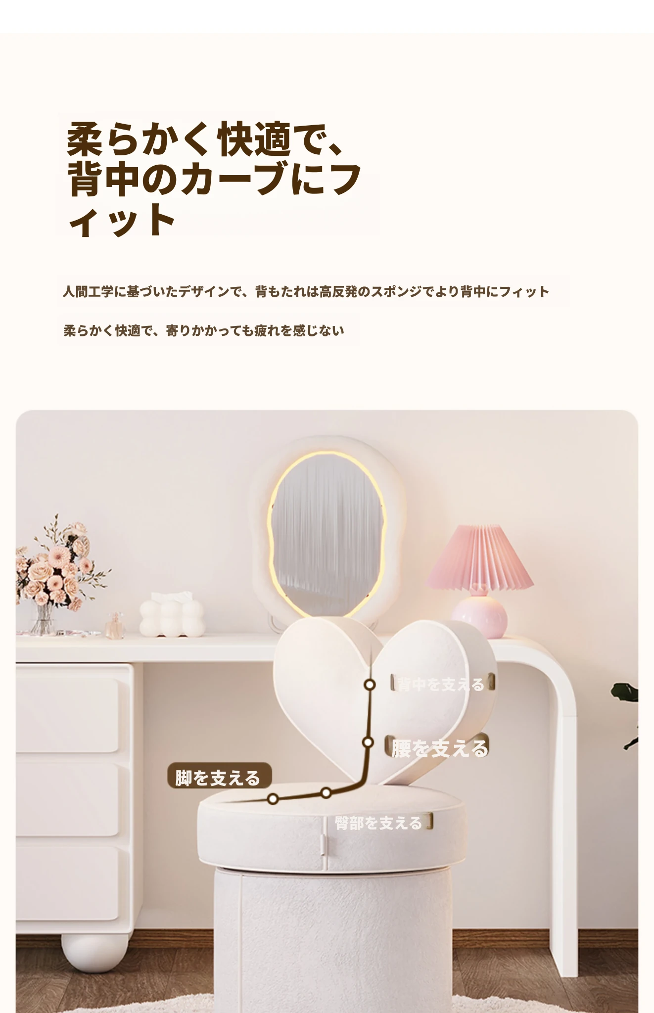 高級感あふれるハート型メイクアップスツール - 寝室にぴったりの回転式ドレッシングチェア!クリーム風デザインの背もたれ付き、快適さとスタイルを兼ね備えた自宅用アイテム。あなたのビューティータイムを特別に演出します!