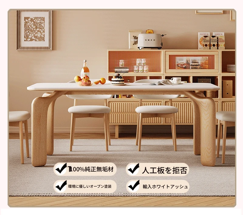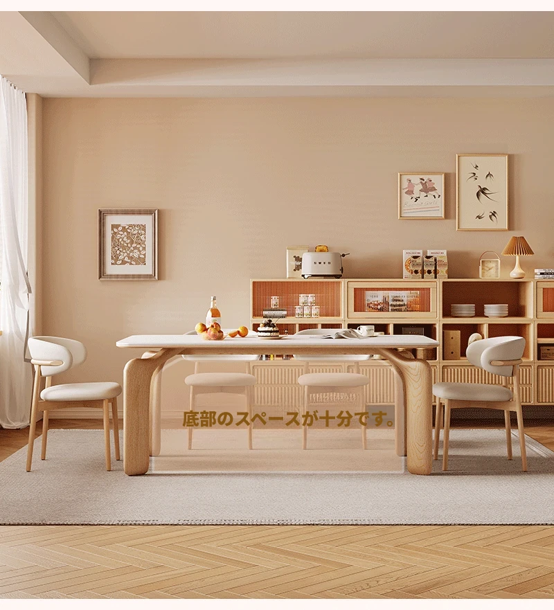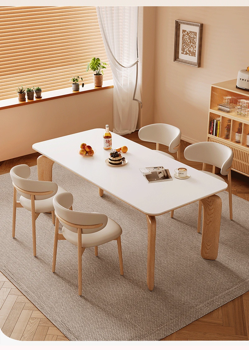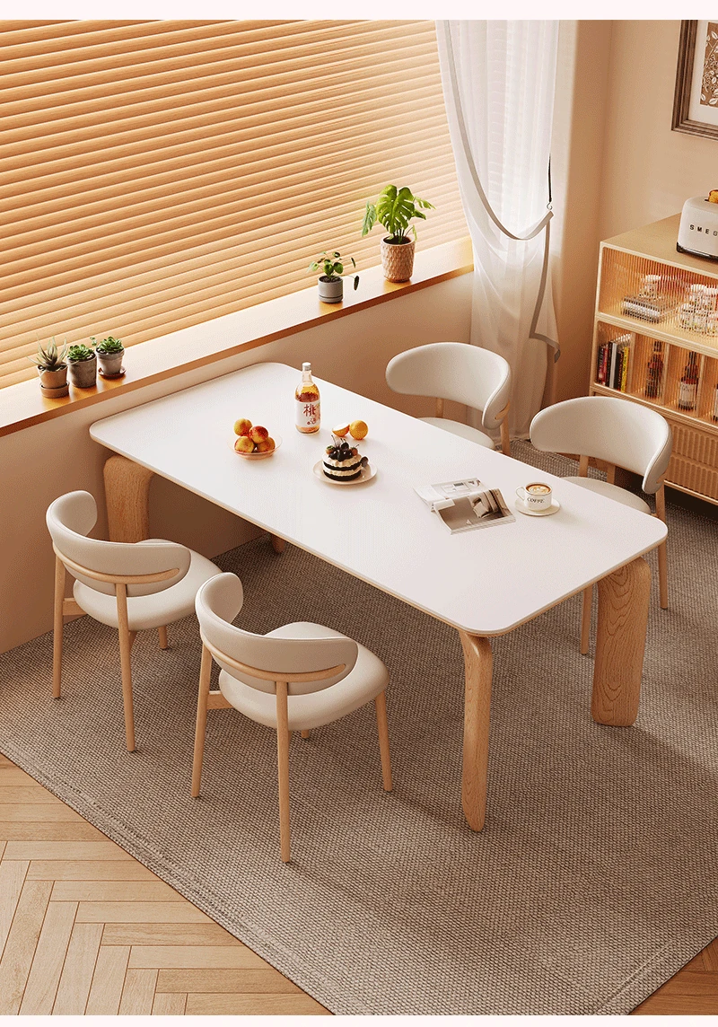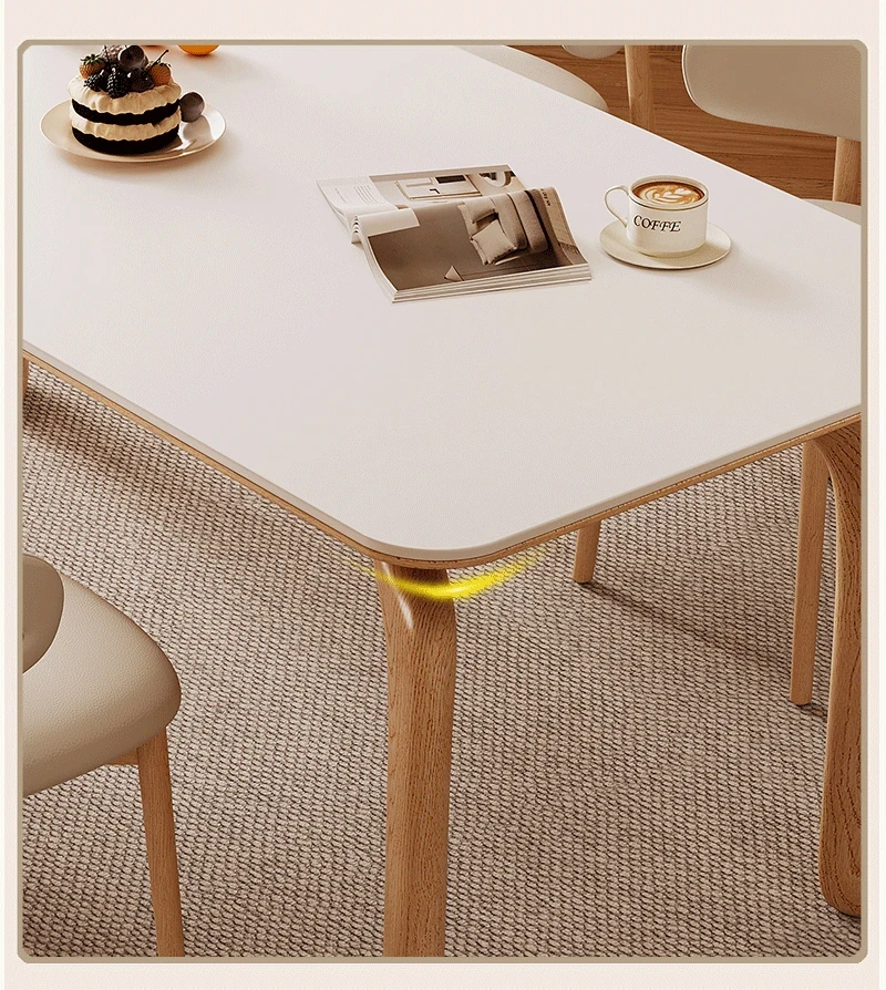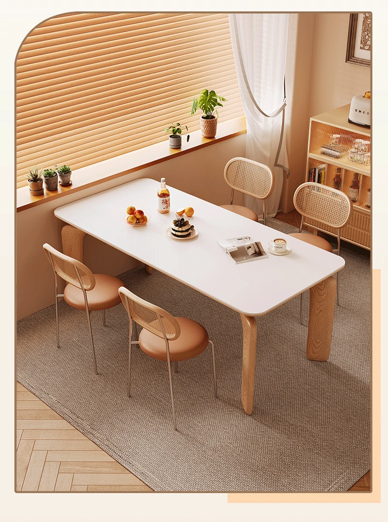 無垢材のクリーム色レトロ岩板ダイニングテーブル ホワイトアッシュ製 エレファントレッグデザイン コンパクトな小型住宅に最適なモダンシンプルな長方形テーブルで、スタイリッシュな食卓を演出します!