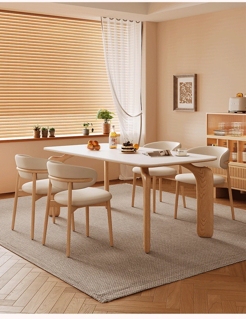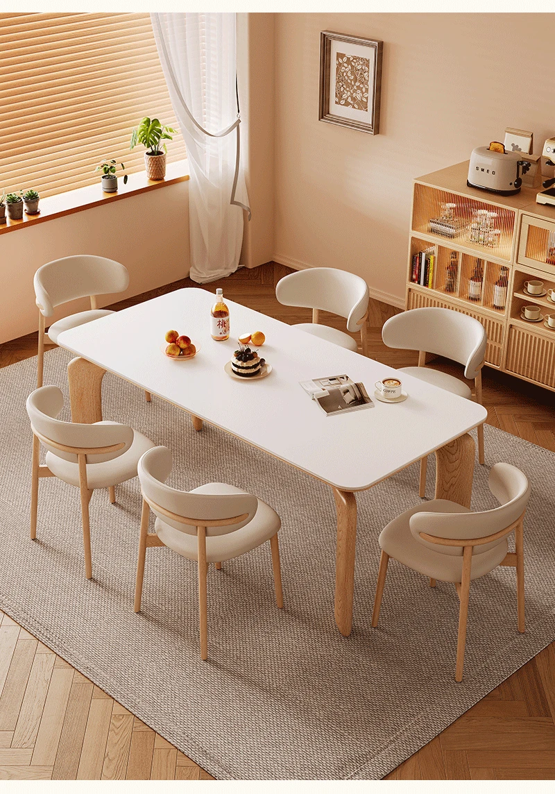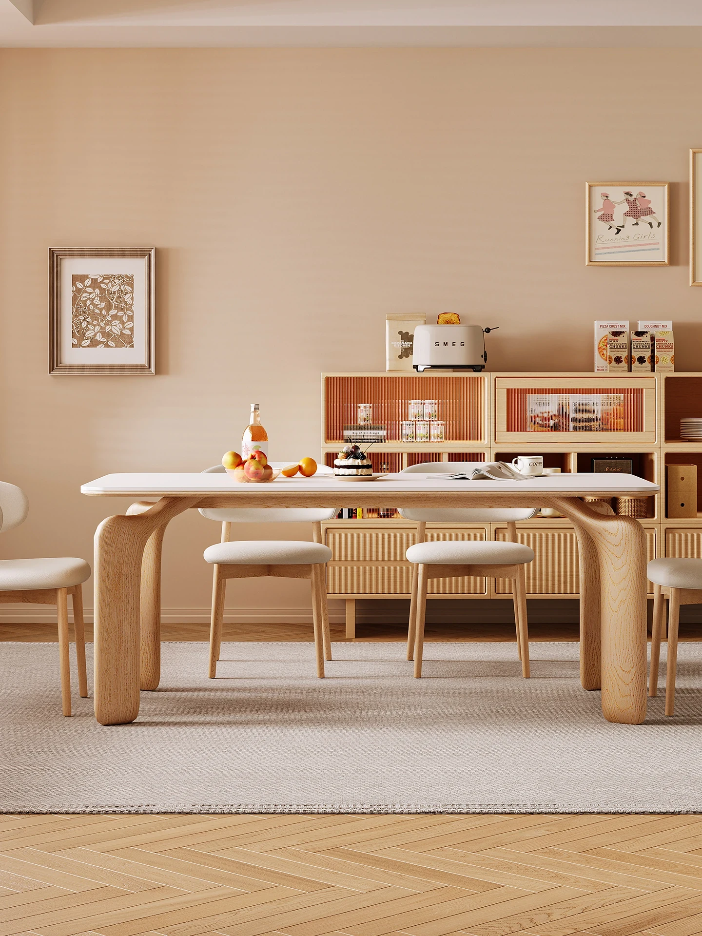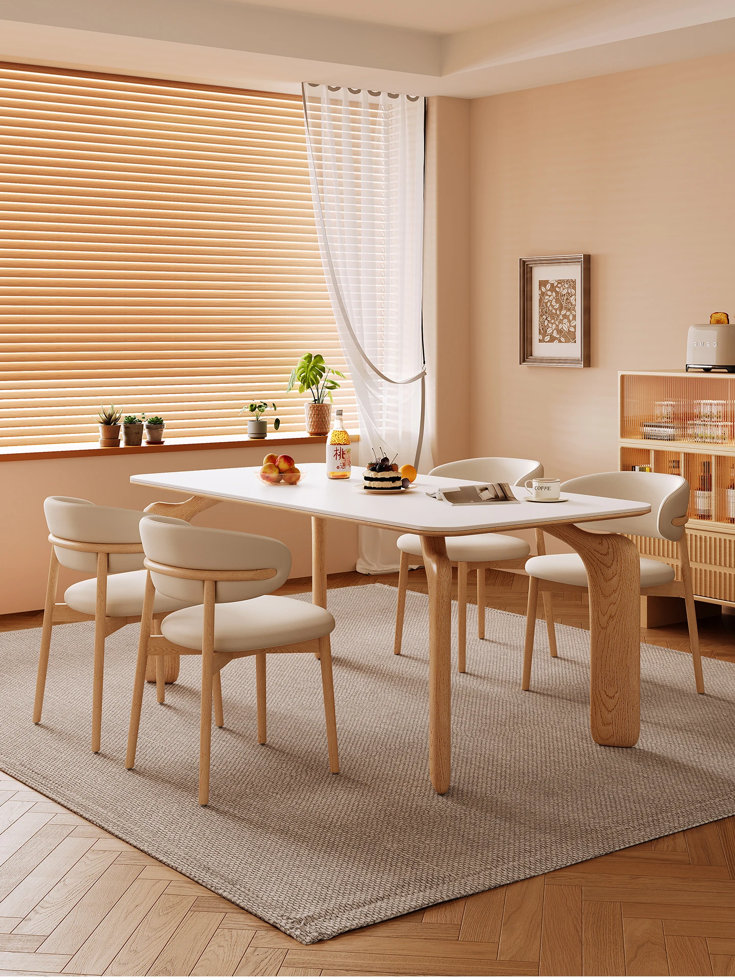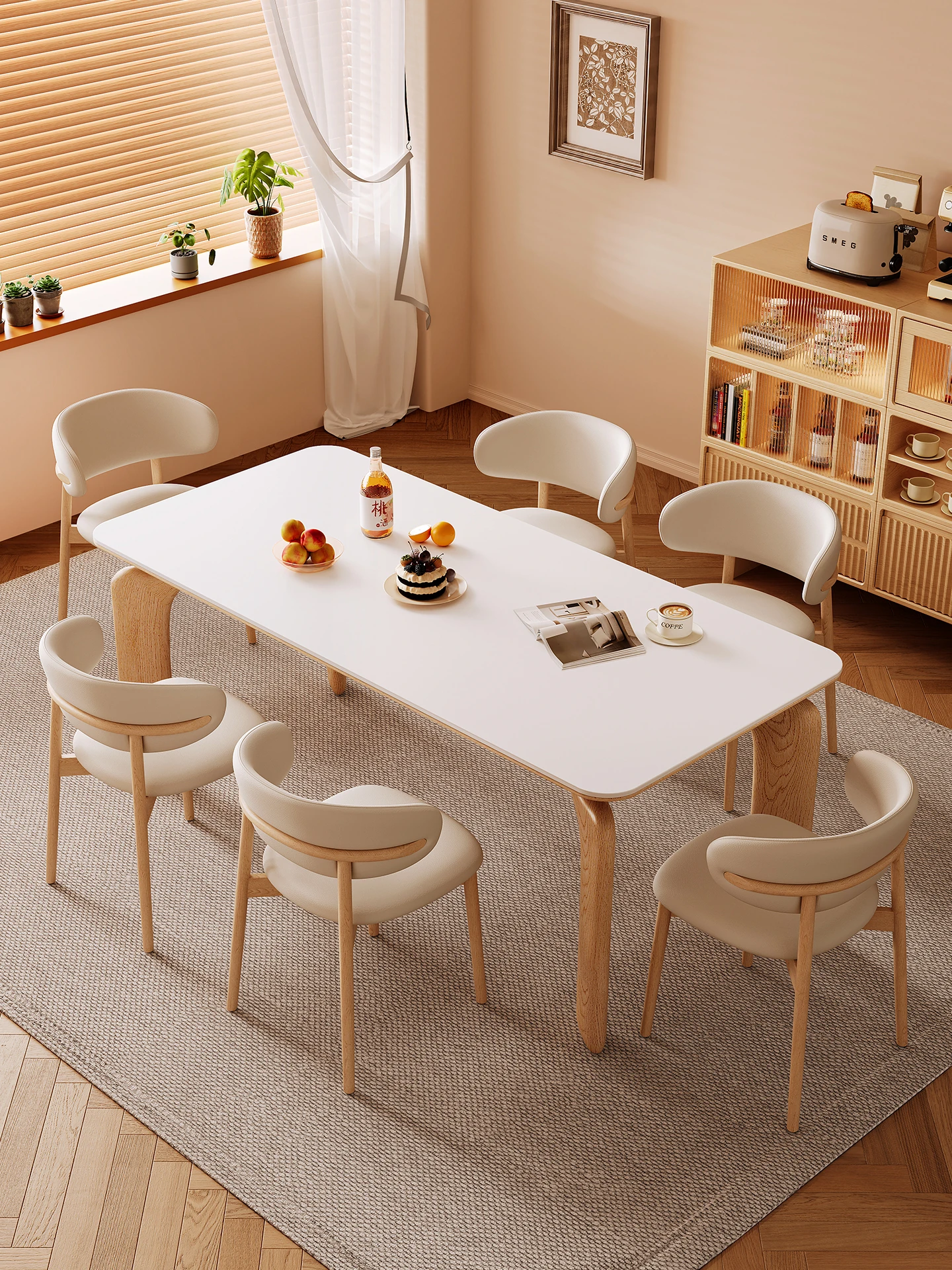 無垢材のクリーム色レトロ岩板ダイニングテーブル ホワイトアッシュ製 エレファントレッグデザイン コンパクトな小型住宅に最適なモダンシンプルな長方形テーブルで、スタイリッシュな食卓を演出します!
