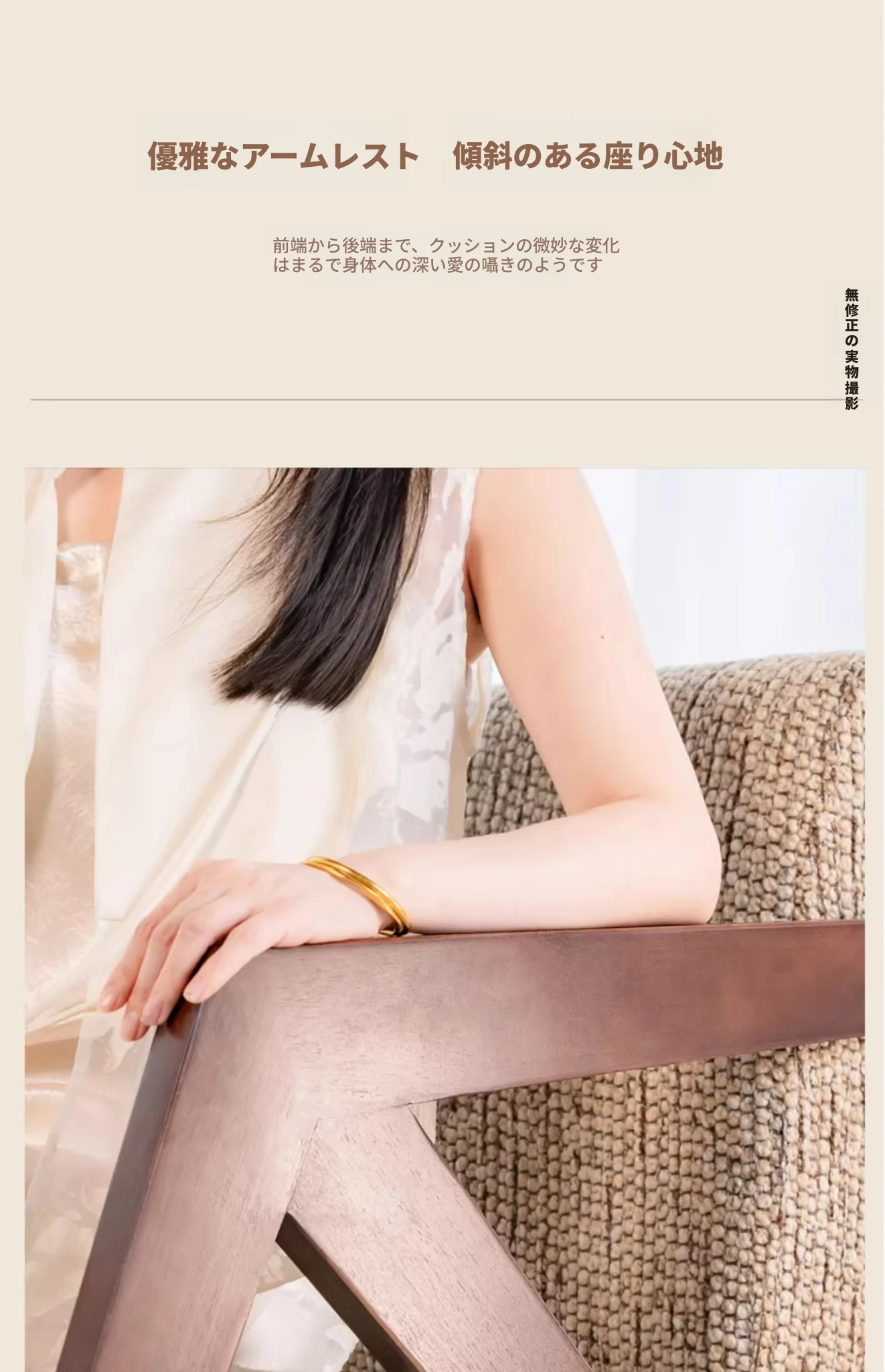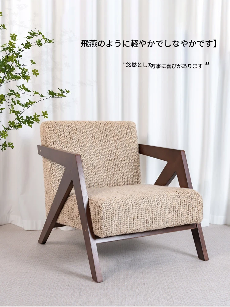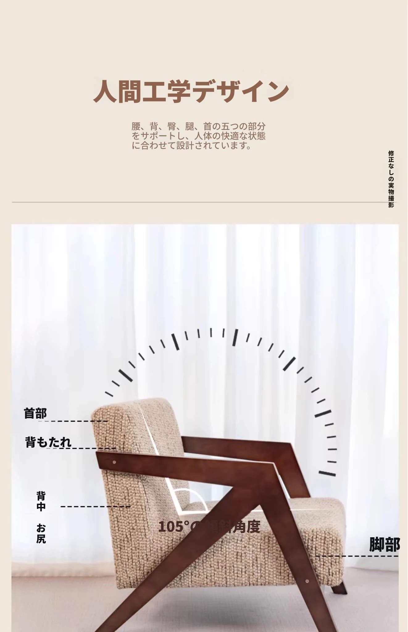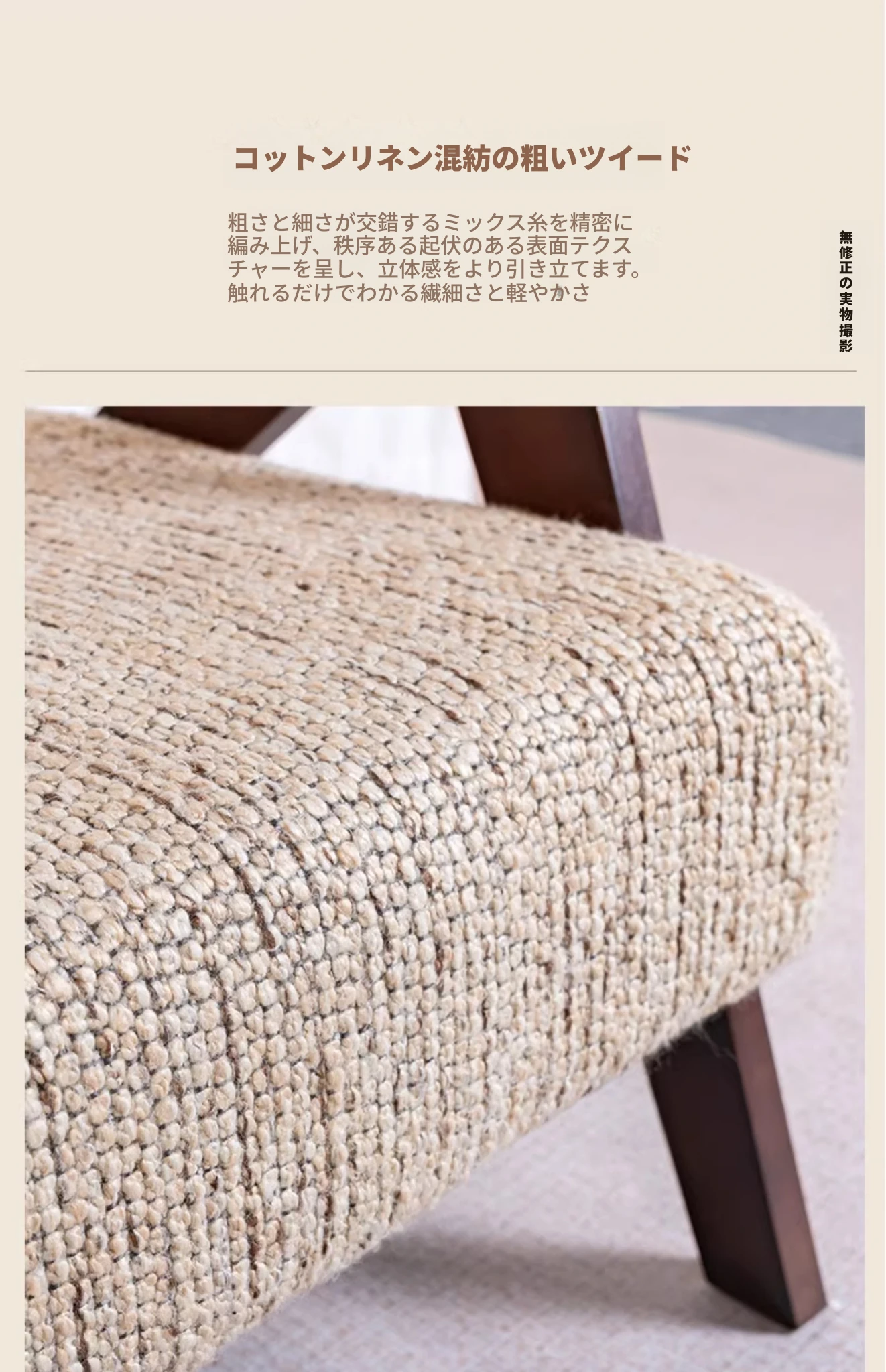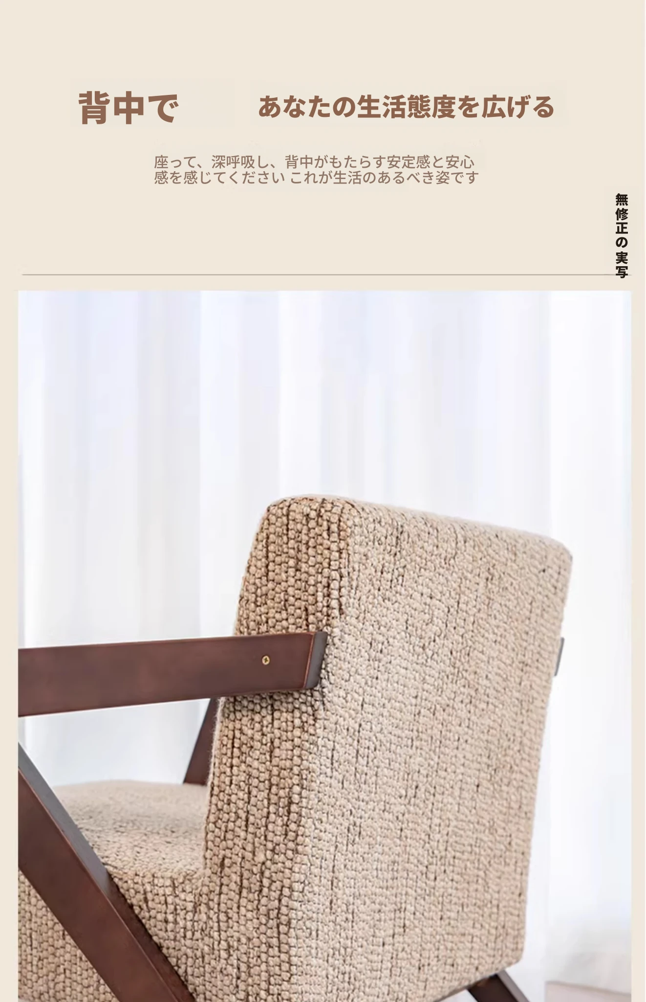 侘寂風デザインの一人掛けソファチェア - レトロな木製と麻素材で作られた、居心地抜群のリラックスチェア。リビングやバルコニーにぴったりな中古風のくつろぎスペースを演出します!