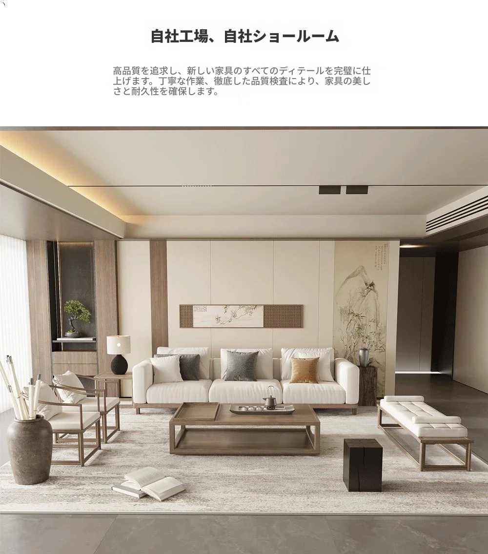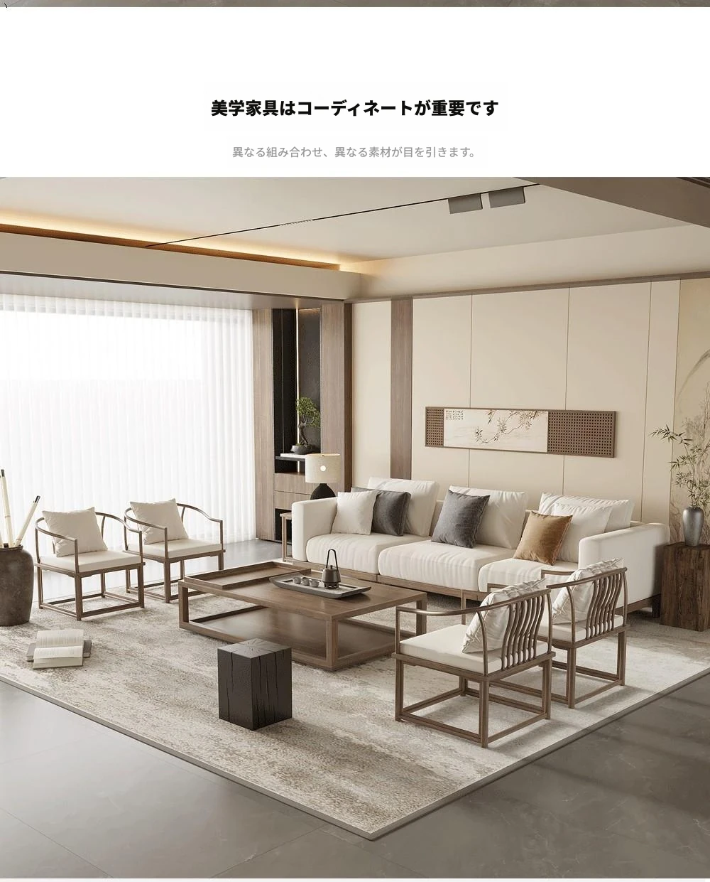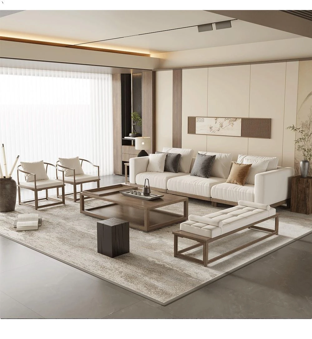 新中式のブラックウォールナットリビングソファ|禅の世界を感じる小型ヴィラ向けファブリックソファ|宋式美学を取り入れた無垢材家具で、あなたの空間に洗練を。