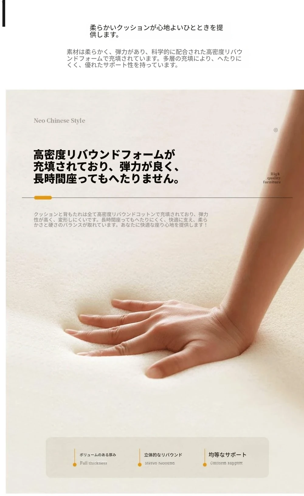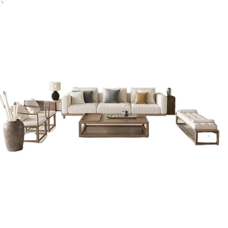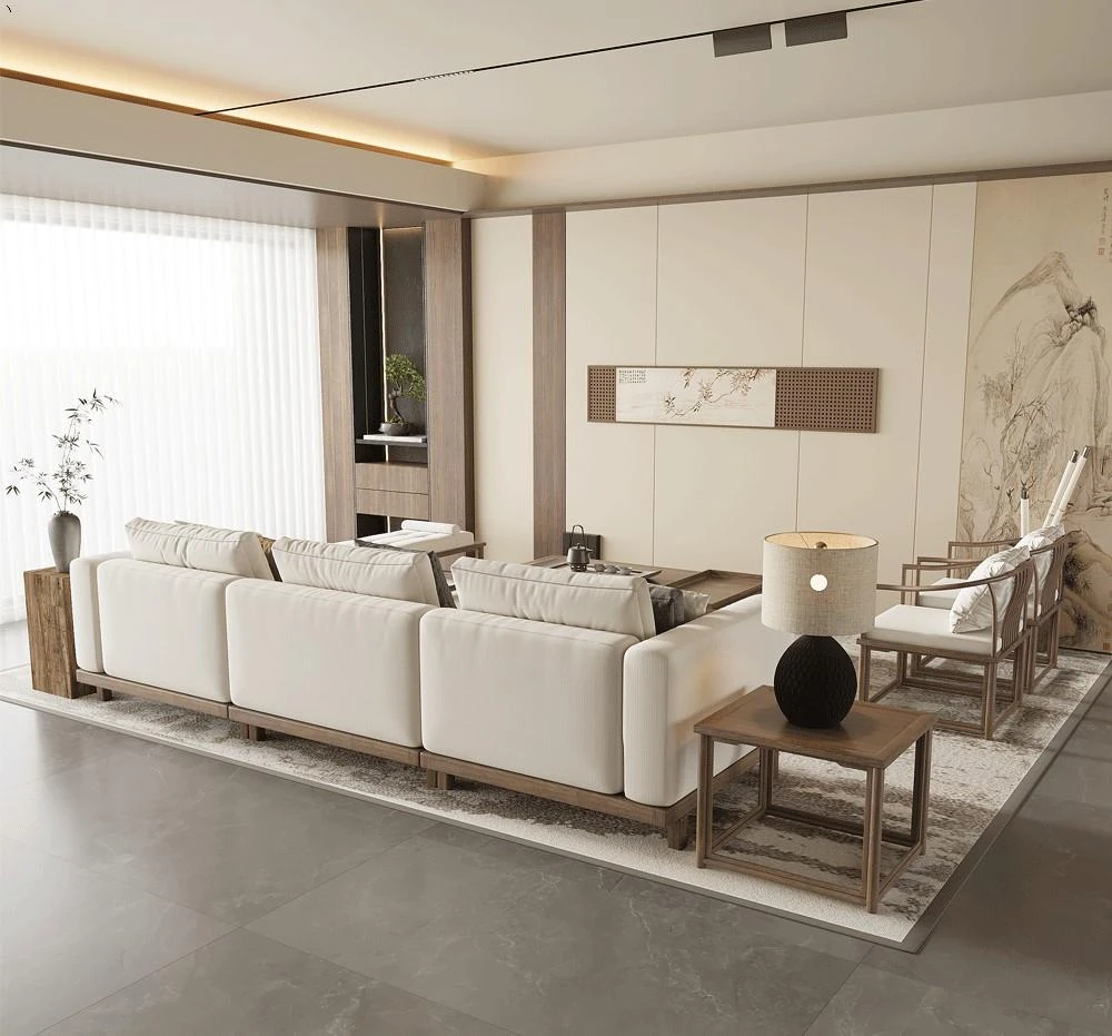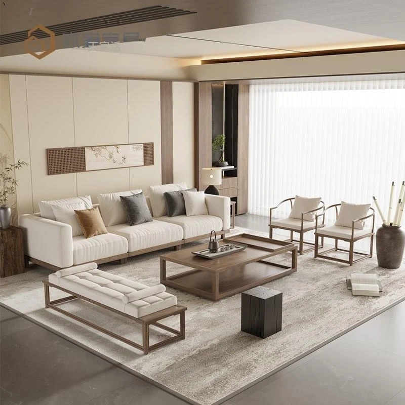 新中式のブラックウォールナットリビングソファ|禅の世界を感じる小型ヴィラ向けファブリックソファ|宋式美学を取り入れた無垢材家具で、あなたの空間に洗練を。